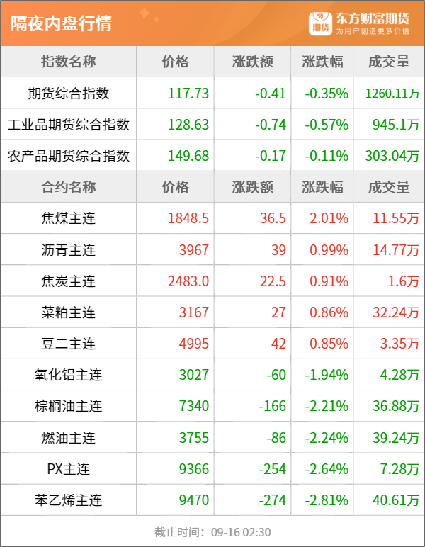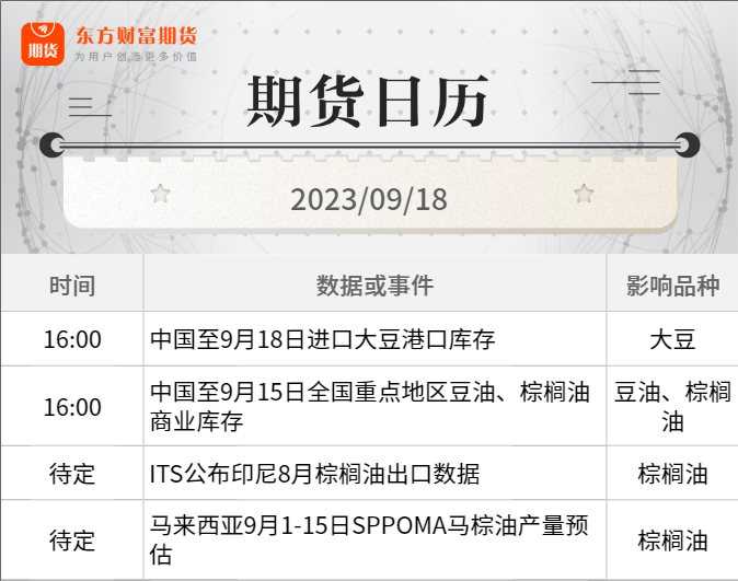 隔夜行情![]() ![]() 每日精选中基协发声:正确看待市场短期波动把握长期向好的大势 欧盟炸锅多国宣布:进口禁令延长!美联储巨亏7300亿 国家外汇局:未来我国外汇市场有基础、有条件更趋平稳 宏观产经中证报:最高法民二庭副庭长周伦军表示,最高法将继续围绕资本市场司法规则体系的完善、相关案件的审理做好工作,深入研究内幕交易和操纵市场行为的民事追责问题,适时出台相关司法解释。 经济日报:财政部数据显示,前8个月全国一般公共预算收入151796亿元,同比增长10%;全国一般公共预算支出171382亿元,同比增长3.8%。财政收入增长,除经济持续恢复、总体回升向好带动外,主要是去年4月份实施大规模增值税留抵退税政策、集中退税较多,拉低基数。 商务部:9月14日,全国稳外贸稳外资电视电话会议在京召开。会议指出,稳住外贸外资基本盘,完成全年目标任务,要用好政策空间,找准发力方向,多措并举打好政策措施“组合拳”,着力抓好帮助企业稳订单拓市场、进一步优化外商投资环境等十项重点工作。 品种资讯黑色系期货 铁矿石:澳大利亚皮尔巴拉港口管理局(PPA)数据显示,黑德兰港口8月铁矿石出口增加至4781.71万吨,7月份为4374.29万吨。黑德兰港口8月向中国出口4017.73万吨铁矿石,7月份为3720.66万吨。(新华财经) 钢材:2023年8月,中国粗钢日均产量278.7万吨,环比下降4.8%;生铁日均产量240.7万吨,环比下降3.8%;钢材日均产量375.9万吨,环比持平。(国家统计局) 近日,四川省安全生产委员会办公室印发《关于开展短流程炼钢、电解铝行业安全生产检查工作的通知》,决定用在全省开展短流程炼钢、电解铝行业安全生产检查工作,坚决杜绝重特大事故、遏制较大事故。(四川省应急管理厅) 农产品期货 大豆:美国油籽加工商协会(NOPA):8月豆油库存为12.5亿磅,市场预期为14.83亿磅,7月份数据为15.27亿磅,2022年8月数据为15.65亿磅;8月大豆压榨量为1.61453亿蒲式耳,市场预期为1.67802亿蒲式耳,7月份数据为1.73303亿蒲式耳,2022年8月数据为1.65538亿蒲式耳。(财联社) 第37周(9月9日至9月15日)111家油厂大豆实际压榨量为177.51万吨,开机率为59.65%;较预估高2.52万吨。预计第38周(9月16日至9月22日)国内油厂开机率小幅下降,油厂大豆压榨量预计175.81万吨,开机率为59.08%。(Mysteel) 棉花:近日,中国棉花协会常务副会长兼秘书长王建红赴新疆调研棉花生产及新年度收购加工准备情况。与会代表均表示稳定的棉花市场有利于行业长远发展,当前棉价不考虑极端行情已处于近10年偏高水平,且下游需求不支持棉价过度上涨。(中国棉花协会) 粮食:农业农村部表示,主汛期虽已接近尾声,天气形势依然复杂,加之厄尔尼诺仍在持续发展,气候存在很大不确定性,早霜、寒露风、台风、旱涝风险仍然较大。当前秋粮陆续进入灌浆成熟期,即将大面积收获。(界面新闻) 棕榈油:船运调查机构SGS公布数据显示,预计马来西亚9月1-15日棕榈油出口量为601196吨,较上月同期出口的665596吨减少9.68%。(新华财经) 有色/贵金属期货 黄金:世界黄金协会15日表示,8月上海-伦敦金价平均价差为40美元/盎司,创历史新高,月环比上升23美元/盎司。对此,世界黄金协会认为,近几个月来黄金需求的恢复和相对平稳的进口量可能导致了国内供需状况的趋紧,进而推高了境内外黄金溢价水平。(新华财经) 沪银:智利铜业委员会(Cochilco)公布的最新报告称,今年全球白银需求料将下降9.4%,主要是由于投资下滑,但市场仍将供不应求。报告称,预计2023年白银供应量将达到31,815吨,较上年增长1.8%,因采矿生产前景较好。预计2023年均价将达到24.60美元。(新华财经) 沪铜:上海期货交易所场外业务部总监鲍建平表示,下一步,平台还将逐步推出国际铜保税仓单交易、铜基差贸易与铜互换交易,促进期现结合,为企业提供更多个性的风险管理工具,助力铜产业高质量发展。(新华财经) 能化期货 纯碱:中盐化工在e互动上表示,截至2023年8月底,中盐青海昆仑碱业有限公司产量为101.94万吨,青海发投碱业有限公司产量为90.11万吨。近期两碱已完成年度检修并投入生产,预计可完成年度生产计划。(每经网) 烯烃:国家能源集团包头煤制烯烃升级示范项目开工仪式在包头市举行;包头煤制烯烃项目是世界首套60万吨/年煤制烯烃示范装置,已建成投产13年。(界面新闻) 天然气:澳大利亚工会联合组织离岸联盟9月17日表示,雪佛龙公司西澳大利亚液化天然气工厂的工人已经开始第二次24小时罢工。工人们于前一日正式开始24小时的全面罢工,并可能持续到10月中旬。(界面新闻) 原油:据美国石油协会,美国8月石油交付同比增长5.4%至3160万桶/日;8月石油供应增长5.6%至2920万桶/日。(财联社) 印度将原油暴利税从每吨6700印度卢比提高到每吨1万印度卢比,自9月16日起生效;将柴油暴利税从6卢比/升下调至5.50卢比/升,自9月16日起生效。(财联社) 环球视野诺贝尔基金会:决定2023年每项诺贝尔奖的奖金都将增加100万瑞典克朗(约合65万元人民币),达到1100万瑞典克朗(约合715万元人民币)。2023年度诺贝尔奖各奖项名单将从10月2日起公布。 央视新闻:9月17日,美国汽车工人联合会针对底特律三大汽车制造商的罢工进入第三天,目前尚无即时解决方案。前一日,通用汽车、福特和Stellantis的代表与工会代表恢复谈判。Stellantis提议在四年半的合同期限内加薪20%,包括立即加薪10%。 彼得森国际经济研究所:包括韩国