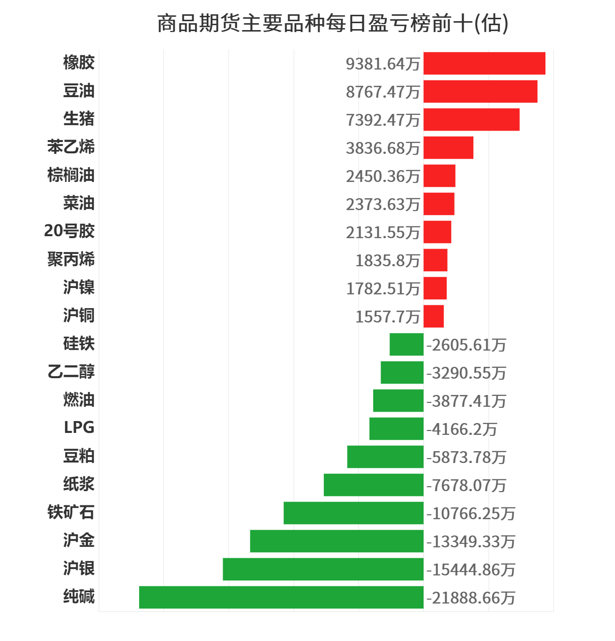 ![]() ![]() ![]() 品种盈亏榜:今日商品期货上榜机构席位中橡胶盈利第一,为9381.64万元。 纯碱亏损第一,为21888.66万元。 ![]() 就橡胶而言,今日盈利前三席位为国贸期货、国投安信、国泰君安,分别盈利2170.51万元、2017.22万元、1902.50万元。 今日亏损前三席位为华泰期货、平安期货、徽商期货,分别亏损1201.82万元、1166.46万元、1078.28万元。 ![]() 就纯碱而言,今日盈利前三席位为光大期货、安粮期货、中信期货,分别盈利1333.58万元、1245.97万元、1192.34万元。 今日亏损前三席位为中粮期货、国投安信、一德期货,分别亏损12203.43万元、4516.70万元、1702.85万元。 ![]() 席位盈亏榜:今日机构席位中南华期货盈利第一,为19263.10万元。 中信期货亏损第一,为66453.49万元。 ![]() 就南华期货席位而言,今日盈利前三品种为沪深、中证1000股指、苯乙烯,分别盈利3723.78万元、2154.89万元、2154.81万元。 今日亏损前三品种为棕榈油、焦煤、沪锌,分别亏损982.57万元、865.66万元、455.26万元。 ![]() 就中信期货席位而言,今日盈利前三品种为棕榈油、纯碱、沥青,分别盈利1219.34万元、1192.34万元、1186.47万元。 今日亏损前三品种为中证1000股指、沪深、铁矿石,分别亏损21484.00万元、9422.99万元、4916.99万元。 ![]() 注:可通过点击东方财富期货APP资讯页面“龙虎榜”及东方财富期货PC端左侧“龙虎榜”查看各类机构持仓及盈亏榜单信息。 ![]() ![]() 以上图表数据来源:东方财富Choice (文章来源:东方财富研究中心) (责任编辑:admin) |