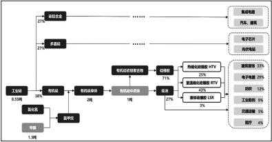 图为BDO产能加速投放 第二,有机硅发展前景广阔。有机硅是对含硅高分子有机化合物的统称,包括由氯甲烷与硅粉生成的单体、将单体水解得到的中间体以及中间体再加工产生的硅橡胶和硅油等产品。有机硅兼备有机物和无机物的优良性质,具有耐高低温、耐气候老化性、耐腐蚀、电气绝缘、表面张力大和无毒无味等优异特性,广泛应用于建筑、新能源汽车、动力电池、光伏、LED驱动电源、5G通信、电子电气和电力设备等领域,生活中常见的玻璃胶和电脑CPU散热的硅脂都是有机硅产品。目前,有机硅正逐步替代传统有机材料,成为大多数战略新兴产业的基础原材料。 2017—2019年,受行业景气度低和环保能控政策严格影响,中小有机硅生产企业遭到淘汰,有机硅行业集中度快速提高,CR5达到71%。截至2023年8月,全国有机硅中间体产能约为267万吨,主要集中在新疆(26%)、山东(16%)和浙江(16%)。有机硅中间体表观消费量从2017年的89万吨逐步增长到2022年的135万吨,年均复合增速为8.7%,远高于其他传统化工原材料。据第三方资讯机构统计,2024年,全国有机硅中间体新增产能将为95万吨,预计带来123.5万吨甲醇需求增量,而新疆暂无新增产能。