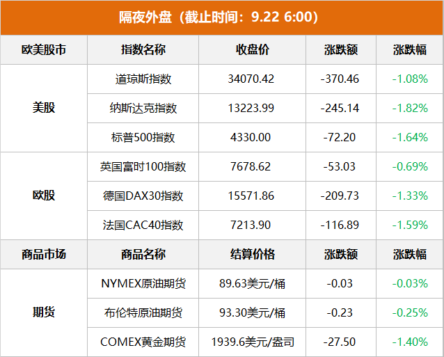美股:标普500指数收跌72.20点,跌幅1.64%,连续第三个交易日下跌,报4330.00点。道指收跌370.46点,跌幅1.08%,报34070.42点。纳指245.14点,跌幅1.82%,报13223.99点。 欧股:德国DAX 30指数收跌1.33%,报15571.86点。法国CAC 40指数收跌1.59%,报7213.90点。英国富时100指数收跌0.69%,报7678.62点。 亚太股市:9月21日,香港恒生指数收跌1.29%,报17655.41点;恒生科技指数收跌1.85%,报3849.27点;日经225指数收跌1.22%,报32619.00点。韩国KOSPI指数收跌1.75%,报2514.96点。 第一财经:收报于24.59点、下跌0.93%,已经“跌无可跌”的标普香港创业指数,在9月21日再次刷新收盘新低。指数已经快“跌没了”的背后,香港创业板指数为代表的小盘股流动性问题凸显。业内人士认为,过去十年,散户股票交易额停滞不前,但小型股的数量却急增,是目前港股“小票”流动性低迷的关键原因。 摩根大通:美联储9月再次跳过加息,会后声明语言与7月会议几乎一致,为今年再次加息敞开了大门。鉴于美联储的鹰派立场,预计债券收益率在短期内将进一步上行并带动美元强势,亚洲市场或随美股承压。高企的利率水平最终会给经济降温,导致收益率下降。