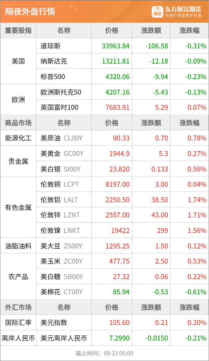 隔夜行情![]() ![]() 每日精选王炸开始!首套存量房贷利率下调将正式启动 全球食糖短缺有望缓解,“第一功臣”可能是这种农作物…… 各地利好消息频出,钢市将迎“超级黄金周”? 宏观产经新华社:中共中央总书记、国家主席、中央军委主席习近平近日就推进新型工业化作出重要指示指出,新时代新征程,以中国式现代化全面推进强国建设、民族复兴伟业,实现新型工业化是关键任务。要完整、准确、全面贯彻新发展理念,统筹发展和安全,深刻把握新时代新征程推进新型工业化的基本规律,积极主动适应和引领新一轮科技革命和产业变革,把高质量发展的要求贯穿新型工业化全过程,把建设制造强国同发展数字经济、产业信息化等有机结合,为中国式现代化构筑强大物质技术基础。 新华网:记者22日从财政部获悉,为落实中美两国元首巴厘岛会晤重要共识,根据国务院副总理、中美经贸中方牵头人何立峰与美国财政部部长珍妮特·耶伦达成的共识,中美双方商定,成立经济领域工作组,包括“经济工作组”和“金融工作组”。“经济工作组”由中美两国财政部副部长级官员牵头,“金融工作组”由中国人民银行和美国财政部副部长级官员牵头。两个工作组将定期、不定期举行会议,就经济、金融领域相关问题加强沟通和交流。 21财经:据记者了解,今年6月-7月地方已上报建制县隐性债务风险化解试点方案,目前监管部门已初步批复方案及额度,特殊再融资债券或在下半年重启发行,可用于置换隐性债务,以缓释债务风险。特殊再融资债券额度将超过万亿,并向12个高风险省份倾斜。 品种资讯黑色系期货 螺纹钢:2023年9月中旬,重点统计钢铁企业共生产粗钢2133.53万吨、生铁1954.88万吨、钢材2106.14万吨。其中钢材日产210.61万吨,环比增长2.94%,同口径相比去年同期增长0.39%,同口径相比前年同期增长9.18%。(中钢协) 据目前了解,近期暂无钢厂有明确计划复产或者检修计划,而由于多数钢厂处于盈亏点附近,而产能利用率一直处于高位。随着国庆假期来临,秋冬季环保限产或将有所措施,不排除后期有发生变化,综合目前计划情况以及上期检修延续影响下,预计下周全国高炉铁水或下降0.1万吨左右。(Mysteel) 煤炭:8月份,规模以上工业主要能源产品生产均保持增长,其中原煤生产有所加快。数据显示,今年8月份煤炭市场供应比较充足,煤炭产量达到了3.8亿吨,同比增长2.2%。全社会煤炭库存处于一个相对比较高的水平,其中全国主要港口8月末存煤6133万吨,比7月末下降13.6%。(中国煤炭工业协会) 大连商品交易所发布关于调整焦煤期货JM2401合约交易限额的通知,经研究决定,自2023年9月26日交易时(即9月25日夜盘交易小节时)起,非期货公司会员或者客户在焦煤期货JM2401合约上单日开仓量不得超过200手,在焦煤期货其他合约上单日开仓量不得超过1,000手。(财联社) 铁矿石:Mysteel统计全国钢厂进口铁矿石库存总量为9486.34万吨,环比增加653.86 万吨;当前样本钢厂的进口矿日耗为301.45万吨,环比增加0.75万吨 ,库存消费比31.47 ,环比增加2.10天。(Mysteel) 农产品期货 生猪:本周国内生猪价格以降为主。据中国养猪网的数据,9月22日,生猪(外三元)价格为16.26元/公斤,与上周五(9月15日)的16.62元/公斤相比,下降2.2%。从一周均价来看,本周生猪均价为16.38元/公斤,与上周16.61元/公斤的均价相比,下降1.4%。(澎湃新闻) “海关发布”官微消息,海关总署、农业农村部发布《关于防止瑞典非洲猪瘟传入我国的公告》。其中明确,禁止直接或间接从瑞典输入猪、野猪及其产品。(界面新闻) 白糖:北京华商储备商品交易所有限责任公司计划公开竞卖食糖,竞卖数量为12.67万吨。竞卖品种为白砂糖。本次竞卖分两场进行,第一场竞卖的是旧榨季生产的2.67万吨白砂糖,竞价交易时间为2023年9月27日9时至11时;第二场竞卖的是2023年生产的10万吨白砂糖,竞价交易时间为2023年9月27日13时至17时。(财联社) 玉米:据样本企业数据测算,2023年8月,全国工业饲料产量2878万吨,环比增长6.1%,同比增长5.9%。饲料企业生产的配合饲料中玉米用量占比为22.8%,同比下降8.0个百分点;配合饲料和浓缩饲料中豆粕用量占比11.9%,同比下降4.0个百分点。(中国饲料工业协会) 有色/贵金属期货 黄金:对于黄金后市走势预测,西南证券研报显示,黄金上涨周期并未结束,政策密集落地后效果逐渐显现,金九银十国内消费旺季来临,黄金价格有望保持高位。(中国证券报) 碳酸锂:融通高科副总裁王明霞表示:“碳酸锂回收的盈亏临界点是17万元/吨。不同的工艺、不同的设备分化程度不一样,它的回收临界点是不一样的。相信随着规模化、效率提高、设备自动化的提高,回收临界点可能会降到15万元、16万元。”(每日经济新闻) 碳酸锂价格大幅下跌后,分析人士表示,缺少自有矿石的锂盐企业成本通常超过20万元/吨,部分企业已出现成本倒挂。鑫椤锂电周三指出,从目前价位看,已经有25%的碳酸锂产能处于亏损状态中,近期也能看到一些江西、四川企业的减产、检修。如果跌破15万元,则将有接近45%的产能亏损,因此15万这条线是很强的支撑。(财联社) 铜:华泰证券研报指出,本周多要素继续呈现共振向上趋势,铜铝价格短期或维持高位;关注电解铝年内供给变化;市场开始关注矿企分红率,高股息公司关注度提升。 能化期货 原油:摩根大通分析师马利克(Christyan Malek)预测,近期的油价飙升
