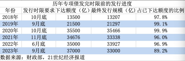 在监管部门提出“新增专项债券力争在9月底前基本发行完毕”的要求下,近期地方债的发行进度备受关注。 据Wind数据统计,截至9月24日,今年新增专项债(不包含中小银行专项债)发行规模为3.16万亿。如果加上本周待发行的规模,截至9月末今年新增专项债发行规模约3.3万亿,完成已下达额度的九成。这意味着今年专项债发完了大部分,但在发行时限前的完成度略低于往年。 展望看,四季度仍有数千亿专项债额度待发行,包括已下达未发行的四千亿专项债额度及中小银行专项债额度。再加上或将发行的特殊再融资债券,四季度二者的发行规模可能达到大几千亿甚至超万亿,进而对社融增长形成支撑。 发行进度不及预期 在7月24日召开的中央政治局会议提出“加快地方政府专项债券发行和使用”后,21世纪经济报道曾在8月初报道,当时监管部门已通知地方,要求2023年新增专项债需于9月底前发行完毕,原则上在10月底前使用完毕。 8月28日,财政部部长刘昆在全国人大常委会会议作《国务院关于今年以来预算执行情况的报告》时表示,加力提效实施好积极的财政政策,今年新增专项债券力争在9月底前基本发行完毕,用于项目建设的专项债券资金力争在10月底前使用完毕。同时,研究扩大投向领域和用作项目资本金范围,引导带动社会投资。 从过往来看,“发完”的要求有特定的指向:一是发完仅指向用于项目建设的专项债额度,中小银行专项债额度不作硬性要求,因为中小银行专项债并不会形成实物工作量。二是仅要求已下达额度的发行完毕,未下达的额度不在这一要求之中。 今年3月,全国人大批准的预算报告显示,今年新增专项债额度3.8万亿元。9月20日,财政部国库司司长李先忠在国新办吹风会上表示,1-8月,已下达新增专项债券额度是3.7万亿元,各级财政部门持续加快专项债券发行使用。 从发行数据看,截至9月24日,今年新增专项债(不包含中小银行专项债)发行规模为3.16万亿,完成已下达额度的85%。 按照《地方政府债务信息公开办法(试行)》,省级财政部门应当在发行前5个以上工作日公开专项债发行的相关信息,包括规模、期限及偿还方式等基本信息及拟发行专项债券对应项目信息。 换言之,本周拟发行的专项债在上周已公布。记者根据中国债券信息网统计显示,本周拟发行的新增专项债规模为1419亿。考虑到专项债由省级政府发行、信用级别高,专项债基本都能成功发行。加上待发行的规模后,截至9月底,今年新增专项债发行规模将达到3.3万亿,完成已下达额度的九成,意味着今年专项债发完了大部分。 其中福建、浙江、青岛等地方已完成专项债发行。比如福建省早在6月宣布,6月8日福建在中央国债登记结算有限公司成功发行新增政府债券561.49亿元。至此,除厦门自发自还部分外,今年财政部下达福建的新增政府债务限额已全部发行完毕,福建成为全国首个完成全年新增政府债券发行任务的省份。 值得注意的是,今年专项债在发行时限前的完成度略低于往年。据记者梳理,过往全国层面一般要求在当年9-10月底前发完:2018年、2019年、2020年专项债发行时限要求分别是10月底前、9月底前、10月底前。2021年发行后置,但也要求当年11月底前完成发行。2022年上半年由于疫情影响、宏观经济下行压力加大,专项债发行时限要求提前至当年6月底。 ![]() 另据统计,此前几年在监管部门要求发完的时限前,专项债的发行进度至少达到96%,最高达到99.9%,意味着地方基本完成了当年专项债的发行。但今年发行进度为89.2%,略低于往年。 西部省份某地市债务办人士表示,我们在9月发行最后一批专项债,按照要求,专项债券项目只能是2023年财政部、发改委两部委审核通过的在建项目,或者以前年度已经安排过专项债券资金的项目。“上级部门还通知,这批额度尽量发,如果额度发不完,可调整用于偿还拖欠款,所以就不着急。” 数千亿额度待发行 展望看,今年已下达的专项债额度中还有4000亿待发行。如果再加上中小银行专项债额度,今年四季度待发行的新增专项债额度将达到6200亿。 中小银行专项债额度来自两部分,一是往年未发完的额度1247亿。央行今年初发布的《2022年第四季度中国货币政策执行报告》披露,2020-2022年新增5500亿元地方政府专项债券,专项用于补充中小银行资本金。截至目前已发行4253亿,剩余1247亿。 二是今年可能预留的中小银行专项债额度1000亿。今年专项债额度中还有1000亿额度待下达,从近年惯例看,这部分额度可能是预留中小银行专项债的额度。当然,中小银行专项债额度发行较慢,经常结转下年发行。比如2020年两千亿中小银行额度当年仅发行了500多亿,剩余结转至2021年发行。 据记者了解,今年6月-7月地方已上报建制县隐性债务风险化解试点方案,目前监管部门已初步批复方案及额度,特殊再融资债券或在四季度重启发行,可用于置换隐性债务,以缓释债务风险。特殊再融资债券额度将超过万亿,并向12个高风险省份倾斜。 特殊再融资债券置换隐性债务的过程中,地方隐性债务余额减少,但地方政府债务余额增加,这意味着特殊再融资债券发行额度将计入社融。比如2021年1月在国债净融资为负且无新增地方债发行的情况下,央行社融口径下的政府债券净融资达到2437亿元,其原因就在于当月发行了约3600亿特殊再融资债券。 综合来看,四季度新增专项债和特殊再融资债券的
