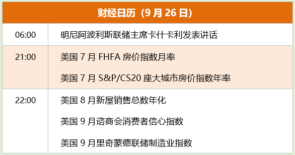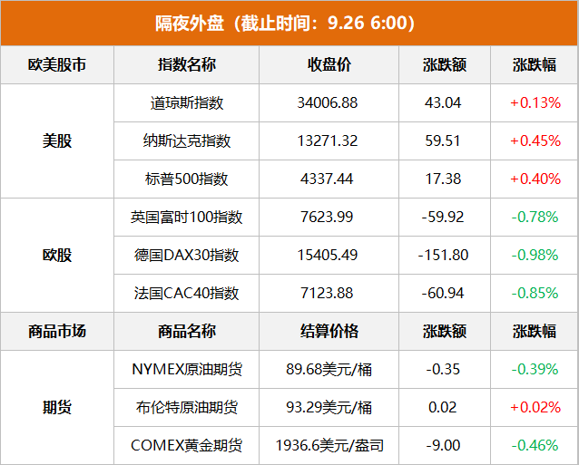 美股:道指收涨0.13%,报34006.88点;纳指收涨0.45%,报13271.32点;标普500指数收涨0.40%,报4337.44点。 欧股:德国DAX 30指数收跌0.98%,报15405.49点。法国CAC 40指数收跌0.85%,报7123.88点。英国富时100指数收跌0.78%,报7623.99点。 亚太股市:9月25日,香港恒生指数收跌1.82%,报17729.29点;恒生科技指数收跌2.72%,报3882.9点。日经225指数收涨0.95%,报32704.50点。韩国KOSPI指数收跌0.51%,报2495.30点。 央视新闻:当地时间9月25日,国际评级机构穆迪投资者服务公司(Moodys)表示,美国政府如果在月底前无法通过支出法案而停摆,将对美国的信用评级产生负面影响。穆迪当天表示,政府停摆将凸显美国的机构和治理实力的薄弱。但是穆迪称,停摆不太可能对美国的债务偿还能力产生重大影响,预计政府停摆的时间将较为短暂,对政府的干扰有限。 标普:现预计美国经济今年将增长2.3%,之前预计为1.7%;预计美国经济增长将在2024年放缓至1.3%,2025年为1.4%;预计美联储在这一轮加息周期中还会再加息一次。 欧洲央行行长拉加德:衰退不是基准情景的一部分,欧洲央行并未讨论降息。最近的各项指标表明欧元区第三季度经济活动进一步疲软,服务业创造就业机会放缓,整体增长势头放缓。通胀率将在很长时间内维持在较高水平。 中国基金报:无牌经营的加密货币交易所JPEX被香港证监会点名警告并转介警方处理后,香港警方共收到逾2300宗报案,涉及金额达14亿港元以上。据报道,虚拟资产交易平台JPEX涉嫌诈骗案,截至9月22日,共有11人被捕。日前,香港证监会表示,鉴于近期公众对不受监管的虚拟资产交易平台的关注,正采取多项措施加强对虚拟资产交易平台的监管。