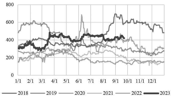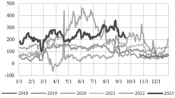 图为欧洲汽油裂解价差(单位:美元/吨)