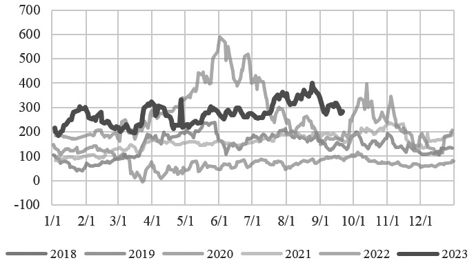图为美国汽油裂解价差(单位:美元/吨)