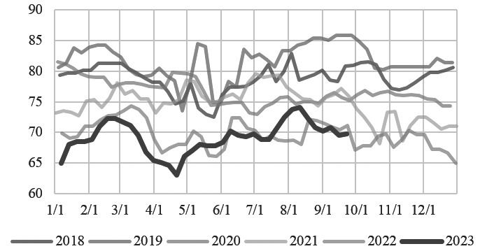 图为PX与石脑油价格走势(单位:美元/吨、美元/吨) 9月19日,俄罗斯政府表示计划从10月1日至2024年6月对所有类型的石油产品征收每吨250美元的出口关税,以解决燃料短缺问题。9月21日,俄罗斯政府宣布,将临时限制汽油和柴油的出口,以避免国内市场出现短缺。叠加美国商业原油库存下降、OPEC延长减产措施,原油供应趋紧担忧升温,美油盘中再度大涨。与此同时,美国商业原油即将进入累库周期,且不排除美联储年底进一步加息可能,因此综合来看,国际油价未来或存下跌空间,但底部依然有支撑,PX或跟随原油振荡运行。 2短期上涨明显,PXN未来有压缩可能 石脑油价格上周先涨后跌,截至9月21日,绝对价格环比下跌0.6%至706美元/吨,周均价格环比上涨0.14%至711美元/吨。石脑油价格周内跟随原油价格冲高回落,自身基本面变动不大。9月石脑油裂解装置利润回落,东北亚石脑油裂解开工率进一步下降,中国台湾CPC3号装置计划9月下旬停车,日本Tosoh裂解装置9月上旬意外停车半个月。裂解开工进一步下跌,市场又对下游需求不够乐观,石脑油价格承压回落。 上周PX和石脑油价差(PXN)上涨,截至9月20日,PXN收于437.54美元/吨,环比上涨19.58美元/吨。PX-MX价差收于79.57美元/吨,环比上涨14.30美元/吨。上周国际油价刷新年内高点,成本端强势,石脑油、PX价格跟涨。叠加PX近期开工下降,供应趋紧,涨势明显,而石脑油检修回归,需求疲弱拖累涨幅。综合来看,PXN上周周度数据上涨明显,然而周中受原油端拖累PXN小幅压缩。由于原油端多空因素交织,且近期不排除价格走弱可能,PX价格或跟随下跌,PXN进一步压缩。 调油逻辑方面,美国自9月15日开始切换冬季汽油,夏季汽油产生的高辛烷值需求回落,汽油裂解价差大幅回落,一定程度上标志着汽油消费开始趋弱,但整体利润目前仍处于高位。一旦未来走出芳烃调油需求强劲的格局,PX的价格支撑则会出现一定的松动。如果缺乏这一利好,PX价格上行驱动便显得不足。 目前,国内PX期货也上市了一周时间,价格一路下跌,主要是由于相较于TA2405,PX2405估值偏高,加上市场上做扩PTA加工费、做缩PX-SC价差的策略频出,更加重了空头情绪。 3开工率回升,PX亚洲产量出现提升 亚洲PX开工率方面,中国、韩国、日本、印度及亚洲平均保持稳定或小幅上行。近期韩国Lotte一套50万吨PX装置已于上周末重启;韩货GS一套55万吨PX装置重启推迟至10月下旬,另一条40万吨PX装置预期近日重启。日本Eneos一条19万吨装置停车检修5月16日左右,预计9月下重启。印度部分装置9月炼厂检修,负荷下滑。浙江石化一套900万吨装置9月11日歧化检修降负。截至9月22日,亚洲PX负荷整体回升3.2个百分点至72.7%。截至8月31日,PX亚洲产量在480.85万吨,年内呈现上涨趋势。此前东北亚部分关停的歧化装置可能重启,开工率出现回升的同时PX产量也会提升,进一步增加供应。到今年年底,PX在供应端的增量远超于损失量。 国内方面,受聚酯利润及杭州亚运会影响,聚酯端降负明显,目前已经跌破90%,拖累PTA开工心态,从而影响国内PX开工。就PX基本面而言,在不考虑浙石化PX装置检修的情况下,尽管需求端有汉邦220万吨和逸盛海南250万吨PTA装置在四季度重启或投产,但依旧难改PX累库格局。如果浙石化检修顺利落地,形势将有所改变。 4上行驱动不足,PX价格随成本端波动 国际方面,近期PXN偏强维持,石脑油和PX价格跟随成本端原油涨跌为主,二者基本面不见起色,对价格支撑力度一般。近期成本端走势振荡,但远期看在供应缺口放大的背景下,成本端年内整体还将偏强势运行。而石脑油价格因裂解开工下滑导致基本面支撑较弱,价格也将跟随原油。另外,国内PTA期货价格下行,同时聚酯开工下滑,影响开工心态,在未来需求支撑不足的预期下,短期PX绝对价格更多跟随成本端波动。而PXN预计将偏强维持,后续走势关注宏观市场心态及原油成本端。 国内方面,PX目前产能基数4373万吨/年,未来1—2年投产计划已知的有裕龙岛300万吨,远远不及PTA投产计划的1/5,因此长期来看,国内的PX供应仍将有较大缺口,而到今年年底,PX仍可能面临供应过剩的难题。