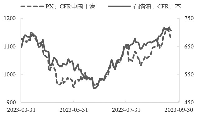 图为PX与原油价格走势(单位:美元/桶、美元/吨) PX方面,截至9月20日当周收盘,亚洲PX周度市场价格上涨。CFR中国台湾价格平均在1149.87美元/吨,FOB韩国价格平均在1126.87美元/吨,环比均上涨32.50美元/吨,涨幅分别为2.83%和2.88%。上周PX价格上涨主要是由于对原油市场供应趋紧的担忧情绪持续,叠加亚洲经济预期改善,国际油价上涨至年内高点,成本强势,带动PX价格上涨。就日度价格而言,PX表现不佳,主要由于9月19日、20日原油在美联储立场仍然“鹰”派、市场缺乏进一步利好影响下价格下行。