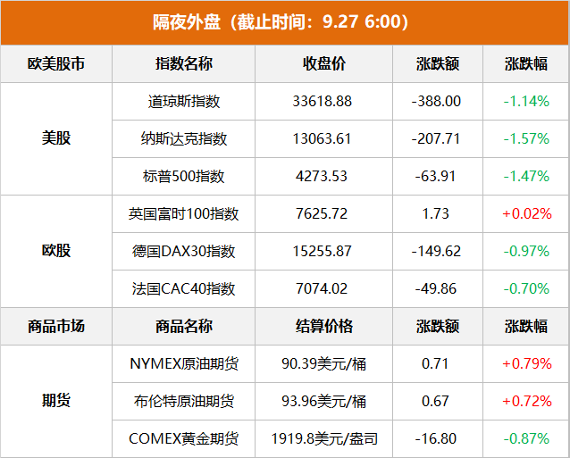 美股:标普500指数收跌63.91点,跌幅1.47%,报4273.53点。道指收跌388.00点,跌幅1.14%,报33618.88点。纳指收跌207.71点,跌幅1.57%,报13063.61点。 欧股:德国DAX 30指数收跌0.97%,报15255.87点。法国CAC 40指数收跌0.70%,报7074.02点。英国富时100指数收涨0.02%,报7625.72点。 亚太股市:9月26日,香港恒生指数收跌1.48%,报17466.9点;恒生科技指数收跌1.69%,报3817.27点。日经225指数收跌1.06%,报32359.00点。韩国KOSPI指数收跌1.31%,报2463.15点。 穆迪:美国政府如果在月底前无法通过支出法案而停摆,将对美国的信用评级产生负面影响。政府停摆将凸显美国的机构和治理实力的薄弱。但是穆迪称,停摆不太可能对美国的债务偿还能力产生重大影响,预计政府停摆的时间将较为短暂,对政府的干扰有限。 摩根大通CEO戴蒙:针对美联储的基准利率,最糟糕的情况是升至7%且出现滞胀。关于升息,从5%升至7%的200个基点会比从3%升至5%更痛苦:从0%升至2%,几乎等于没有升息;从0%升至5%让一些人措手不及,但没有人会认为不可能升至5%。不确定世界是否准备好迎接7%。 印度:监管机构担心中小企业板块发生操纵股价的可能性加大,近几个月来这个板块吸引了大量散户投资者。印度主要股票指数创下历史新高,其中,拥有63支成份股的中小企业IPO指数鹤立鸡群,自2019年底以来飙升约1900%,而同期孟买证交所Sensex指数上涨59%。