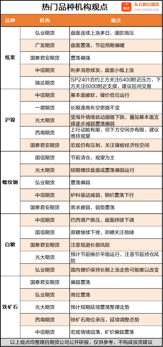 热门品种机构观点![]() 黑色系期货硅铁产量高位 市场面临过剩(国信期货) 多空交织下 预计短期铁矿石延续震荡整理走势(光大期货) 农产品期货棉花整体而言短期往上和往上的空间都不大(五矿期货) 2024年上半年在巴西开榨前 泰国印度两国将持续支撑国际糖价(混沌天成期货) 有色/贵金属期货人民币贬值对贵金属的推动或减弱 外盘贵金属面临调整压力(美尔雅期货) 不锈钢及镍现货市场价格以及采购意愿回落 节前期价偏弱(中财期货) 能化期货需求偏弱背景下 近期PP主力合约预计震荡偏弱为主(西南期货) 短期国际原油价格上涨增强PTA成本支撑 预计期价下行空间有限(瑞达期货) (文章来源:东方财富研究中心) (责任编辑:admin) |