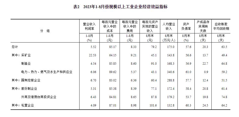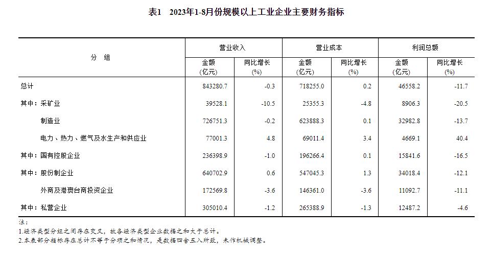1—8月份,全国规模以上工业企业实现利润总额46558.2亿元,同比下降11.7%,降幅比1—7月份收窄3.8个百分点(按可比口径计算,详见附注二)。 1—8月份,规模以上工业企业中,国有控股企业实现利润总额15841.6亿元,同比下降16.5%;股份制企业实现利润总额34018.4亿元,下降12.1%;外商及港澳台商投资企业实现利润总额11092.7亿元,下降11.1%;私营企业实现利润总额12487.2亿元,下降4.6%。 1—8月份,采矿业实现利润总额8906.3亿元,同比下降20.5%;制造业实现利润总额32982.8亿元,下降13.7%;电力、热力、燃气及水生产和供应业实现利润总额4669.1亿元,增长40.4%。 1—8月份,主要行业利润情况如下:电力、热力生产和供应业利润总额同比增长53.4%,电气机械和器材制造业增长33.0%,通用设备制造业增长12.9%,专用设备制造业增长3.6%,汽车制造业增长2.4%,石油和天然气开采业下降10.8%,纺织业下降15.0%,计算机、通信和其他电子设备制造业下降20.6%,农副食品加工业下降26.0%,煤炭开采和洗选业下降26.3%,非金属矿物制品业下降26.8%,有色金属冶炼和压延加工业下降27.0%,化学原料和化学制品制造业下降51.1%,黑色金属冶炼和压延加工业下降57.1%,石油、煤炭及其他燃料加工业下降68.9%。 1—8月份,规模以上工业企业实现营业收入84.33万亿元,同比下降0.3%;发生营业成本71.83万亿元,增长0.2%;营业收入利润率为5.52%,同比下降0.71个百分点。 8月末,规模以上工业企业资产总计163.01万亿元,同比增长6.6%;负债合计93.87万亿元,增长7.0%;所有者权益合计69.14万亿元,增长6.1%;资产负债率为57.6%,同比上升0.2个百分点。 8月末,规模以上工业企业应收账款23.41万亿元,同比增长9.5%;产成品存货6.15万亿元,增长2.4%。 1—8月份,规模以上工业企业每百元营业收入中的成本为85.17元,同比增加0.42元;每百元营业收入中的费用为8.33元,同比增加0.28元。 8月末,规模以上工业企业每百元资产实现的营业收入为79.2元,同比减少6.1元;人均营业收入为175.0万元,同比增加5.2万元;产成品存货周转天数为20.3天,同比增加1.2天;应收账款平均回收期为63.5天,同比增加6.0天。 8月份,规模以上工业企业利润实现由降转增,同比增长17.2%。 ![]() ![]() ![]() ![]() 附注 一、指标解释及相关说明 1、利润总额:指企业在生产经营过程中各种收入扣除各种耗费后的盈余,反映企业在报告期内实现的盈亏总额。 2、营业收入:指企业从事销售商品、提供劳务和让渡资产使用权等生产经营活动形成的经济利益流入。包括主营业务收入和其他业务收入。 3、营业成本:指企业从事销售商品、提供劳务和让渡资产使用权等生产经营活动发生的实际成本。包括主营业务成本和其他业务成本。营业成本应当与营业收入进行配比。 4、资产总计:指企业过去的交易或者事项形成的、由企业拥有或者控制的、预期会给企业带来经济利益的资源。 5、负债合计:指企业过去的交易或者事项形成的、预期会导致经济利益流出企业的现时义务。 6、所有者权益合计:指企业资产扣除负债后由所有者享有的剩余权益。 7、应收账款:指资产负债表日以摊余成本计量的,企业因销售商品、提供服务等经营活动应收取的款项。 8、产成品存货:指企业报告期末已经加工生产并完成全部生产过程、可以对外销售的制成产品。 9、营业收入利润率=利润总额÷营业收入×100%,单位:%。 10、每百元营业收入中的成本=营业成本÷营业收入×100,单位:元。 11、每百元营业收入中的费用=(销售费用+管理费用+研发费用+财务费用)÷营业收入×100,单位:元。 12、每百元资产实现的营业收入=营业收入÷平均资产÷累计月数×12×100,单位:元。 13、人均营业收入=营业收入÷平均用工人数÷累计月数×12,单位:万元/人。 14、资产负债率=负债合计÷资产总计×100%,单位:%。 15、产成品存货周转天数=360×平均产成品存货÷营业成本×累计月数÷12,单位:天。 16、应收账款平均回收期=360×平均应收账款÷营业收入×累计月数÷12,单位:天。 17、在各表的利润总额同比增长栏中,标“注”的表示上年同期利润总额为负数,即亏损;数值为正数的表明利润同比增长;数值在0至-100%之间(不含0)的表明利润同比下降;下降幅度超过100%的表明由上年同期盈利转为本期亏损;数值为0的表明利润同比持平。 18、在主要分组中,国有控股企业包括国有绝对控股企业和国有相对控股(含协议控股)企业等。外商及港澳台商投资企业包括中外(或与港澳台资)合资经营企业、合作经营企业及外资(或港澳台资)的股东占公司注册资本比例达25%以上的股份有限公司等。私营企业包括私营有限责任公司、私营股份有限公司、私营合伙企业和私营独资企业等。 二、规模以上工业企业利润总额、营业收入等指标的增速均按可比口径计算。报告期数据与上年所公布的同指标数据之间有不可比因素,不能直接相比计算增速。其主要原因是:(一)根据统计制度,每年定期对规模以上工业企业调查范围进行调整。每年有部分企业达到规模标准纳入调查范围,也有部分企业因规模变小而退出调查范围,还有新建投产企业、破产、注(吊)销企业等变化。(二)加强统计执法,对统计执法检查中发现的不符合规模以上工业统计要求的企业进行了清理,对相关基数依规进行了修正。(三)加强数据质量管理,剔除跨地区、跨行业重复统计数据。 三、统计范围 规模以上工业企业,即年主营业务收入为2000万元及