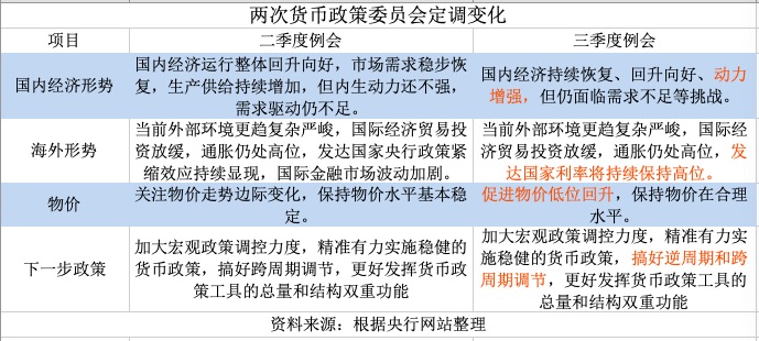 据央行网站,中国人民银行货币政策委员会2023年第三季度(总第102次)例会于9月25日在北京召开。 据记者梳理,和二季度例会相比,三季度例会主要有四大变化:一是对国内经济形势判断更乐观一些,但仍指出当前仍面临需求不足的问题;二是在对海外经济形势判断时明确指出“发达国家利率将持续保持高位”;三是表示要“促进物价低位回升”;四是下一步货币政策要搞好“搞好逆周期和跨周期调节”。 ![]() 从过往经验看,当货币政策委员会例会提及逆周期调节时,下一季度一般有降准或降息的操作,市场机构对四季度降准或降息也抱有预期。 经济动力增强但需求仍不足 三季度例会认为,今年以来宏观政策坚持稳字当头、稳中求进,稳健的货币政策精准有力,加大逆周期调节力度,综合运用利率、准备金等政策工具,切实服务实体经济,有效防控金融风险,为经济回升向好创造适宜的货币金融环境。 相比二季度例会“综合运用政策工具”的表述,三季度例会直接提出“综合运用利率、准备金等政策工具”,这是因为三季度央行于8月份降低政策利率,9月15日又降准25BP。 “近期宏观政策组合拳果断连续出手,财税、房地产、货币政策接连发力,市场预期明显好转,但经济回升弹性仍有待增强,二度降准将继续接力体现政策支持效应,9月降准处于经济回升接力的关键时刻。”一位不愿具名的业内权威专家表示。 此次例会指出,当前国内经济持续恢复、回升向好、动力增强,相比二季度增加了“动力增强”的表述。东方金诚首席宏观分析师王青表示,这个表述相比二季度例会的判断更为乐观,背后是8月宏观经济供需两端数据低位回升,经济复苏势头转强。 从最近发布的月度经济数据来看,经济基本面在逐步改善,PMI、工业企业利润、物价数据、消费均有反映。比如8月制造业PMI为49.7%,指标环比已是连续第三个月上行;8月CPI同比为0.1%,涨幅较上月回升0.4个百分点;8月消费增速为4.6%,相比上月回升2.1个百分点。 但另一方面,PMI还低于荣枯线、工业企业利润仍在下降、物价仍偏低。需求方面,消费增速偏低;投资增速今年持续下降,1-8月降至3.2%;8月出口增速为-8.8%,降幅已收窄,但仍在负值区间。 对于海外形势,三季度例会表示,当前外部环境更趋复杂严峻,国际经济贸易投资放缓,通胀仍处高位,发达国家利率将持续保持高位。其中,对海外利率形势的判断是新增内容,相比二季度“发达国家央行政策紧缩效应持续显现”有明显变化。 发达国家中,美元是全球最重要的国际货币,美联储的货币政策将对其他国家的货币政策带来重要影响。北京时间9月21日凌晨,美联储货币政策委员会FOMC宣布将联邦基金利率目标区间保持在5.25%-5.50%不变。 美联储主席鲍威尔在新闻发布会中表示,从未打算就任何降息的时间发出信号,在适当的时候我们会有降息的时机,但存在太多不确定性。 美联储同时公布的利率点阵图则几乎“鹰到了极致”,不仅暗示在年内还会再加息一次,同时之后也将在较长时间内维持利率不变。利率决议公布之后,利率掉期市场迅速降低了2024年降息的可能性。相关指标显示,交易员已将首次降息的时间点推迟到了明年9月份。 这意味着中美利差倒挂将保持相当长的一段时间,进而可能对人民币汇率形成压力。央行货币政策委员会委员、中国国际经济交流中心副理事长王一鸣9月22日在2023外滩金融峰会上表示,美联储这一轮加息还没有封顶,资本回流美国的态势还没有发生变化,美元尽管短期在加息,但是金融市场的条件甚至比疫情前还要宽松。 此次例会表示,深化汇率市场化改革,引导企业和金融机构坚持“风险中性”理念,综合施策、校正背离、稳定预期,坚决对单边、顺周期行为予以纠偏,坚决防范汇率超调风险,保持人民币汇率在合理均衡水平上的基本稳定。 光大银行金融市场研究部宏观研究员周茂华表示,近几个月人民币波动较大,对内外利空因素有较为充分定价,并且人民币经历多次内外严峻形势考验,市场加快成熟,人民币弹性显著增强。另外,央行稳汇率工具多,在稳定市场预期和汇率方面也积累较为丰富经验。 加大逆周期调节力度 物价方面,二季度例会表示要“关注物价走势边际变化”,三季度例会则表示,“促进物价低位回升。” 物价稳定是中国央行货币政策操作的四大最终目标之一。实践中,低物价将为货币政策的宽松操作提供基础,同时货币政策宽松操作也会支持经济增长、提振物价。 前述不愿具名的业内权威专家表示,随着市场信心恢复以及政策传导效应进一步显现,经济循环畅通程度提升,近期通胀已出现积极变化,8月CPI同比由负转正,PPI同比降幅也连续2个月收敛。9月降准持续增强了金融支持扩大内需的后劲,有利于进一步发挥好金融资源的先期带动作用,支持通胀指标持续温和回升。 对于物价走势,多个监管部门表示,今年底会恢复至往年平均水平。国家发展改革委副主任丛亮9月20日在国新办发布会上表示,价格指标属于经济运行的滞后指标,随着需求稳步恢复,市场信心逐步增强,经济运行持续好转,加上低基数效应逐步减弱,我国物价总水平有望继续回升并逐步回升到年均值水平附近。 此次例会表示,要持续用力、乘势而上,加大宏观政策调控力度,精准有力实施稳健的货币政策,搞好逆周期和跨周期调节,更好发挥货币政策工具的总量和结构双重功能,着