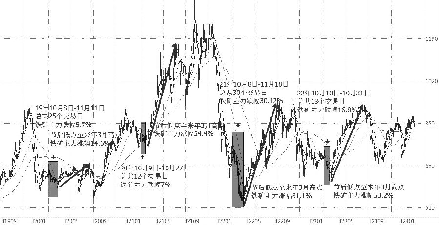 图为铁矿石主力合约走势 通过复盘近几年国庆节前后铁矿石主力合约的走势我们可以看出,国庆节前后7个交易日是一个“分水岭”,由于节前钢厂对炉料有集中补库动作,对于铁矿价格形成一定支撑,而在节后受制于钢厂开工率以及需求端的复工进度,矿价跟随成材出现普遍下行。国庆节前铁矿石主力合约通常处在阶段性上行通道中,国庆节前后7个交易日往往会出现阶段性高点;而在节后1个月左右的时间段内,铁矿石盘面价格会出现一个下行周期,近4年来铁矿石主力合约在节后12—30个交易日内单边跌幅在7%—30%之间;而在节后1个月附近的阶段性底部铁矿石会出现强势反弹,至来年3月达到高点,铁矿石主力合约在4—5个月内涨幅在14.6%—81.1%。 对比近四年走势,我们认为今年铁矿石大概率依循往年走势,节后会出现一波周期性回调,但从长周期看铁矿石维持上行走势。(作者单位:大陆期货) (责任编辑:admin) |