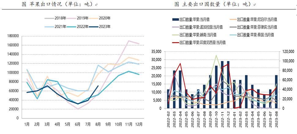 数据来源:WIND 海关总署 国信期货 数据来源:WIND 海关总署 国信期货 我国鲜苹果主要出口东南亚国家,出口优势多来自于价格。我国鲜苹果主要出口国家包括越南、印度尼西亚、孟加拉国、泰国、菲律宾以及尼泊尔。新季苹果上市之后,出口量稍有增加。根据海关总署公布的数据,2023年8月我国鲜苹果出口7.11万吨,环比增加79.25%,同比提高38.35%;1-8月我国鲜苹果累计出口量共计约42.38万吨,同比去年下滑7.31%左右,处于近五年历史偏低位置,整体出口表现不佳。从季节性上看,第四季度及次年第一季度是苹果的出口旺季,新季苹果即将有效供应市场,预计9月份鲜苹果出口或将恢复。但我国鲜苹果出口规模仍然偏小,占总需求量的3%左右,出口变化对我国苹果供需格局影响较为有限。 六、 时令水果供应减少,利好温性水果消费 近年来,水果整体丰产,同时进口水果补充消费者的需求,水果市场选择明显增加。苹果作为水果中的一员,也会受到相关品种的影响。替代水果分为两方面,一方面是储藏类水果的影响,比如与苹果耐储性相当的梨;另一方面是时令水果的影响,比如带有极强季节性的水果大类西瓜,以及柑橘和芒果、草莓等具有口感的时令水果。 近年来,水果整体丰产,同时进口水果补充消费者的需求,水果市场选择明显增加。苹果作为水果中的一员,也会受到相关品种的影响。替代水果分为两方面,一方面是储藏类水果的影响,比如与苹果耐储性相当的梨;另一方面是时令水果的影响,比如带有极强季节性的水果大类西瓜,以及柑橘和芒果、草莓等具有口感的时令水果。9月份水果价格居高运行,截至9月21日,农业农村部重点监测的7种水果平均批发价约6.68元/公斤,较月初下跌0.19元/公斤;但与去年同期相比上涨0.9%,处在近五年历史高位。立秋之后,夏季时令水果供应逐渐减少,剩余部分夏季水果总体质量下滑,天气转凉利好苹果等温性水果需求恢复。具体品种来看,鸭梨价格是与苹果价格相关性最强的水果。河北、安徽等地皇冠梨进入收购尾期,质量有所下滑,价格偏弱运行。但因新季梨减产,价格下跌空间或有限,对苹果消费的冲击或不及预期。梨与苹果耐储性相当,后期需关注梨的销售情况及价格变化。 七、苹果消费季节性分析 苹果作为一种季产年销的水果,带有非常明显的季节性。按五年历史价格统计,上涨概率较大的月份多集中在下半年,分别为:9月、11月和12月。就历史规律而言,一般库存苹果9月底会完成清库,而苹果储存到了后期,质量会有所下滑,好货就成了稀缺品。并且这个时候新季苹果还未完全大量上市,整个市场的库存是处在偏空的状态,同时9月份气温逐渐下降,时令水果慢慢减少供应退出市场,中秋、国庆双节备货,利好苹果的消费。因此果农和客商带有惜售情绪,苹果在9月份涨价也在意料之中。而11、12月份,新果开始有效供应市场,并且临近圣诞节和元旦,节日提振效应明显,苹果需求较为旺盛,驱动价格上行。 而下跌概率较大的月份分布较为分散,主要包括:4月、8月和10月。4月份是比较关键的去库时间节点,一方面,4月份之后气温上升,不少季节性强的时令水果上市,冲击苹果的消费市场;另一方面,库存苹果存放已超半年,后期质量恐有所下滑,且下半年节日不多,节日效应或大打折扣,因此,4月份降价去库的可能性较高。而到了8月份,离清库还剩下一个月的时间,面对的挑战包括但不限于:时令水果继续冲击市场;早熟苹果上市挤占库存苹果的销售份额;由于存放时间长库存苹果自身质量出现下滑等,因此8月份价格下滑比较明显。10月份伴随新季苹果大量上市供应市场,且替代水果梨与苹果的上市期也比较接近,阶段性的供应压力驱动苹果价格有所下滑。 八、晚熟富士开秤价格或高开 市场供应偏紧,好货数量不多,新季开秤价可能高于去年旧季的开秤价格,我们预估大概在3.5元/斤以上。由于货源质量表现各异,不同货源价格或出现明显分化,产地以质论价情况居多。