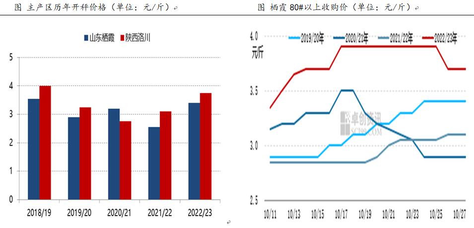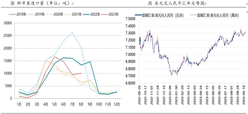 数据来源:WIND 国信期货 数据来源:WIND 国信期货 但我国鲜苹果总体进口规模较小,2010-2020年进口数量仅占总产量的1%左右。进口量小,主要原因在于我国苹果供应稳定,能满足自给自足的需要。据海关总署统计,2023年8月,我国鲜苹果进口量约1.01万吨,环比增加6.02%,同比去年减少24.59%;1-8月累计进口苹果6.46万吨,同比去年下滑13.28%,在五年历史中处在中等位置。一般而言二、三季度是进口旺季,但受国外苹果产区减产、人民币汇率等因素影响,鲜苹果进口量出现一定程度下滑,表现不佳。 四、中秋、国庆双节备货,需求或有恢复 苹果下游消费需求很难精确量化,目前我们用产地走货量作为大致评估的标准,同时结合几个重要节日的备货、销售情况进行检验。从往年情况来看,一般九月底会完成清库,清库进度由西向东逐步推进,山东等东部地区较西北产区而言节奏稍慢,一般于5、6月份开始。经过我们测算,苹果需求价格弹性系数β大概在-0.34左右。苹果需求的价格弹性系数显著为负,意味着苹果需求量与自身价格呈反方向变化,当价格上涨时,理性的消费者会适度减少对苹果的消费,反之,则会增加苹果的消费量。同时,β绝对值为0.34表明苹果需求对自身价格的变动缺乏弹性,意味着价格较大幅度的变化才能带动需求量小的变化。因此产地苹果只有在大幅跌价的时候,去库走货进度才会明显提高。 早熟苹果普遍存在一定质量问题,客商重新考虑订购冷库旧季苹果货源,受货源质量欠佳及节日备货影响,客商采购积极性良好。价格方面,据中果网,山东烟台纸袋红将军80#以上价格约3.50-3.60元/斤(一二级半),纸袋红将军80#以上价格约2.70-3.00元/斤(统货);山东蓬莱光果嘎啦70#以上价格约2.40-2.50元/斤。陕西洛川纸袋早富士70#起步价格约4.30-4.80元/斤(半商品);纸袋早富士70#起步价格约3.60-3.90元/斤(统货)。市场供应偏紧,好货数量不多,新季开秤价可能高于去年旧季的开秤价格,我们预估大概在3.5元/斤以上。由于货源质量表现各异,不同货源价格或出现明显分化,产地以质论价情况居多。 五、新季上市,8月鲜苹果出口增加
