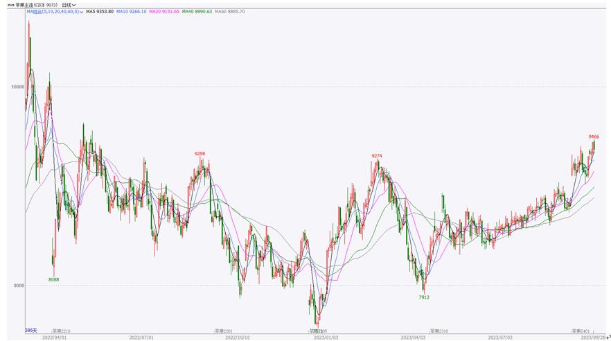 供应端方面,卓创资讯公布2022/2023产季最后一期库存统计,截至9月28日,当前全国冷库目前存储量约为2.65万吨,冷库去库存率为99.70%,基本完成清库。新季产量同比有所增加,但仍不及丰产年份水平,今年商品率或不及去年同期,入库量有所提高,但货源质量或分化严重,关注后期入库情况。需求端方面,周度出货量10.46万吨,出货速度环比有所提高,亦高于去年同期水平。客商以包装自存货及采购礼盒为主,因优质货源价格偏高等问题,向市场发货量不及正常年份数量。 苹果后市主要还是围绕产量及优果率兑现来展开,当前关键点在于新季苹果的开秤价格。早熟苹果开秤价格高,叠加客商采购积极,果农存在较高心理预期,预计今年晚熟富士收购价高开可能性较大,我们预估开秤价格或在3.5元/斤以上。但新季集中上市之后,供应逐渐转向宽松,货源行情两极分化情况或较明显,市场交易重心会转移至需求端,若需求表现不及预期,后期苹果有高位回落的可能,苹果行情或呈现先扬后抑走势。 第一部分 行情回顾 图 AP2401合约走势图