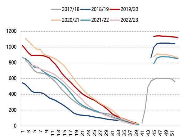 数据来源:卓创资讯 国信期货 数据来源:卓创资讯 国信期货 综合各方调研情况,市场普遍认可新季苹果产量呈恢复性增长态势。卓创资讯在8月初对新季秋收苹果再次进行套袋量统计,预估产量约为3721.05万吨,同比上一产季增幅达到5.75%,后期将继续进行产新调研,修正评估结果。目前来看新季产量同比有所增加,但仍不及丰产年份水平,甘肃等部分产区减产明显,陕西、山西等西北产区产量有所增加。当前陕西地区早熟类富士类逐渐进入尾期,西北产区晚熟富士零星摘袋,整体暂未大量上市,晚熟富士开秤价格会受到旧季苹果的收尾价格和新季早熟苹果价格影响,而后期价格需要关注产量及优果率兑现。今年果个总体偏小,大果占比较少。果锈高于去年,红果占比不多,优质好货占比减少。目前陕西晚熟富士采青货源逐渐开始交易,摘袋之后产区普遍降雨天气,客商担心红果少,成交价格高于往年同期,部分地区采青货源价格上浮0.3元/斤左右,不同地区有差异。今年优果率或下滑,或对晚熟品种开秤价格形成一定支撑。 二、旧季苹果基本完成清库,关注新季入库量 图 全国冷库苹果冷库情况(单位:万吨)