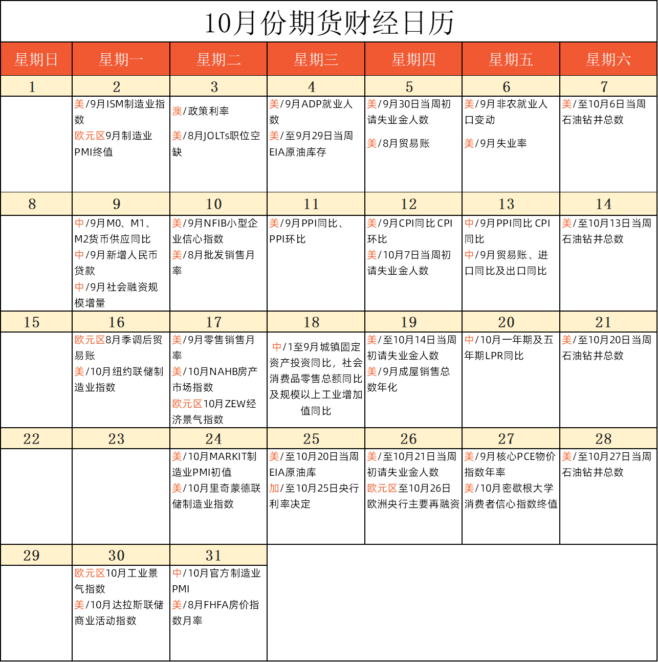 期货日历 | 10月待关注的重要数据与事件一览