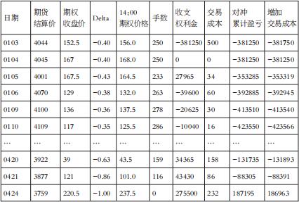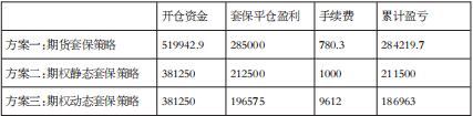 表为每日调整的常规 Delta 动态对冲策略结果 由上表可以看出,若Delta值变大,需要平仓部分螺纹钢期权;若Delta值变小,则需要增加买入螺纹钢看跌期权。 通过对上述三种方案进行对比发现,受现货销售疲软影响,螺纹钢期货跌幅明显,利用螺纹钢期货、期权套保均盈利。其中螺纹钢期货套保盈利明显,但利用螺纹钢期货套保保证金也较高。但由于螺纹钢期权刚上市时,受到投资者的普遍关注,导致开仓权利金较高,影响后期套保效果。方案三期权动态套保策略并不优于方案二期权静态套保策略,主要是受对冲成本和对冲频率的影响。