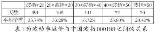图1为中国波指和30天Parkinson历史波动率 方差溢价也存在着明显的规律。这个规律是在风平浪静的日子中方差溢价较大,在“黑天鹅”的日子方差溢价相对较小。例如,表1利用50ETF期权的统计结果展示了方差溢价的规律,显示50ETF期权732个交易日的方差溢价统计结果。由表1可知,50ETF期权的方差溢价在波指处于任何水平下都存在,但是波指在30以下时,相对溢价较高,平均值都在33%以上,波指在30以上时,溢价较低。