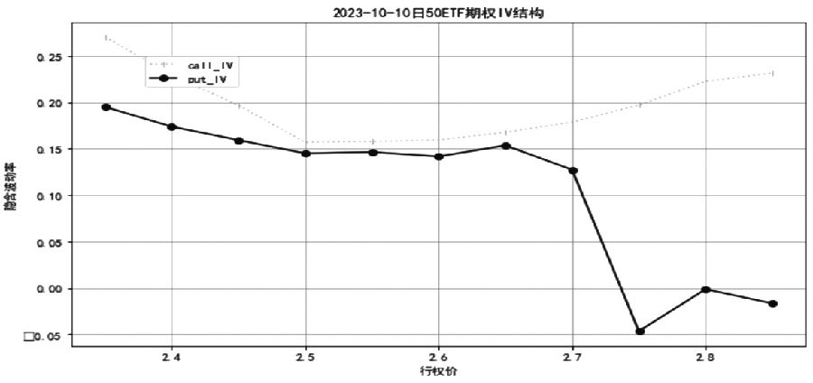 方差溢价产生主要基于以下三个原因:第一,卖出隐含波动率就是卖出保险,故存在一个风险溢价;第二,未来总存在一些不确定性,可能会发生一些历史上没有发生过的情况,需要为这些情况提高价格;第三,做市商会提高其报价,保护他们的业务,从而进一步提升隐含波动率。 由此可得出结论:方差溢价的存在使得双卖期权成为机构投资者的一个主要的期权策略。 到期时IV归0 到期日IV归0是指在期权到期日,虚值期权的时间价值变为0,此时IV通常接近0。当期权的时间价值降至零时,这通常表示市场参与者不再预期标的资产价格会发生波动,并且期权已经不再具有额外的预期收益。 事实上,在实务中不管双卖期权的IV是高还是低,在到期日IV都会归0,因此卖期权在希腊字母VEGA上总会有收益,但是现实交易中卖期权也会出现亏损,这主要是希腊字母GAMMA上的亏损。波动率交易的关键是控制GAMMA风险。 由此可得出结论:双卖策略一定要持有到期,这样不会在VEGA上有亏损。 IV存在偏度 IV的偏度通常指的是在同一个到期日的不同行权价格期权的隐含波动率之间存在明显的不对称性。IV的偏度通常反映了市场对未来波动性变化的预期。如果存在负向偏度,那么市场可能更担心未来价格走低,因此,较低执行价格的期权的IV更高。相反,如果存在正向偏度,市场可能更担心未来价格走高,因此,较高执行价格的期权的IV更高。 图2展示了50ETF期权在2023年10月10日的IV存在明显偏度的情况。该日50ETF收盘价是2.559,则平值期权的行权价是2.55。由图2可知,认购期权的虚值部位存在明显的正偏度信息,认沽期权的虚值部位存在明显的负偏度信息。这表示无论是认购期权还是认沽期权,都是卖虚值期权会比较有优势。 由此可得出结论:双卖策略一定要卖虚值期权,这样比平值期权的IV更有优势。