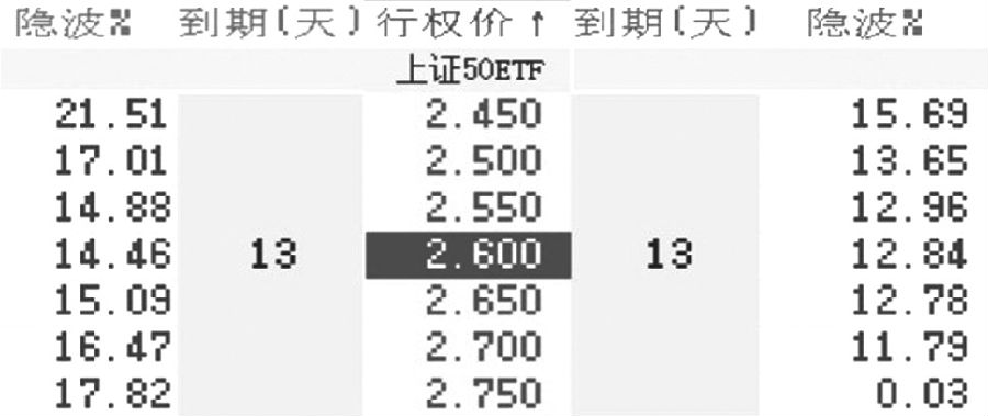 图5为50ETF期权偏度指数的K线 在实务中,如果正偏度过大,那么可以建立牛市比例价差获得偏度回归的收益。图6展示了2023年10月12日50ETF期权近月的合约信息,其中出现了明显的正偏度信息,虚值1档2.65call的IV=15.09和虚值2档2.70call的IV=16.47差距过大,距离均值过远,此时可以建立买1手2.65call,卖3手2.70call的牛市比例价差头寸。
