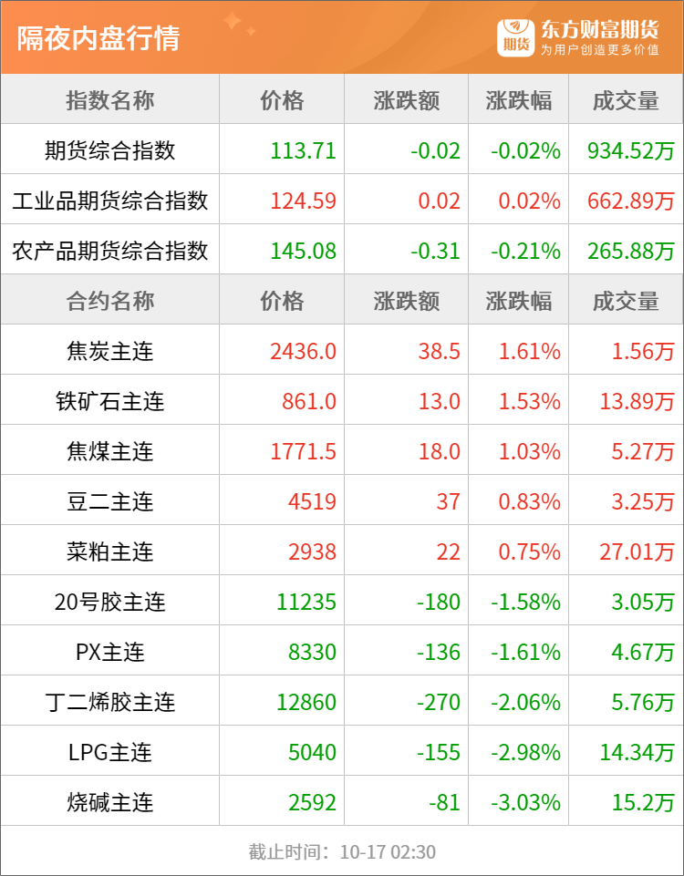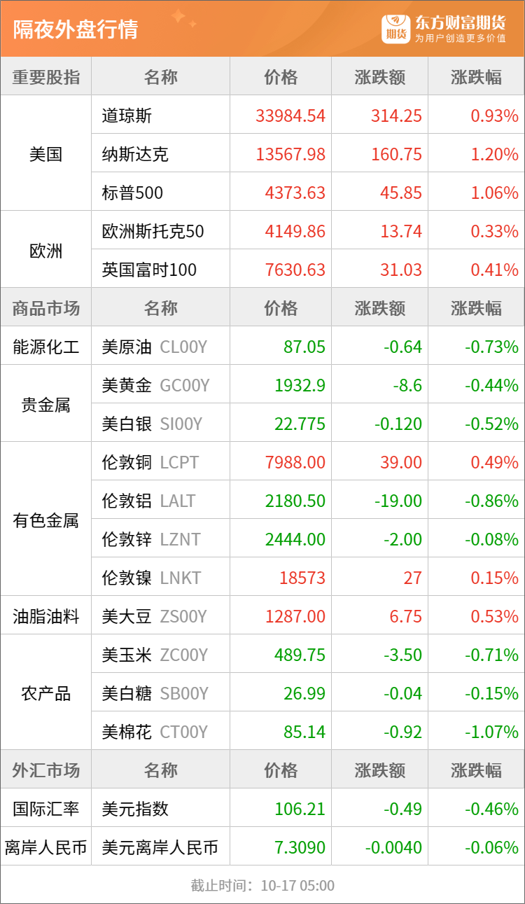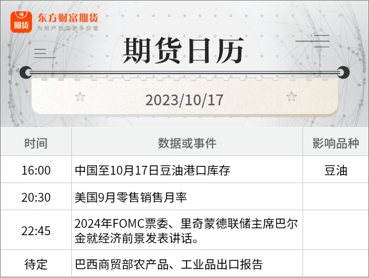 隔夜行情![]() ![]() 每日精选国务院:推动内蒙古高质量发展奋力书写中国式现代化新篇章 巴以冲突愈演愈烈!原油、黄金、白银全线暴涨! 好消息!工行、农行、中行、建行、邮储、交行六大行宣布减费让利 宏观产经新华社:第三届“一带一路”国际合作高峰论坛开幕式将于10月18日在北京举行。中共中央总书记、国家主席、中央军委主席习近平将出席开幕式并发表主旨演讲。 财联社:财联社统计,2023年前3季度合计发行利率债19.52万亿元,创历史新高!为稳住经济增长压力,发挥财政职能功效,地方债、国债发行放量,市场上出现了后续将增发国债的预期。另一方面,为化解地方隐性债务,近期特殊再融资债密集发行。 证券时报:本周二(10月17日),A股市场将正式迎来4条回购指数。有市场分析认为,4条回购指数的发布,进一步提升了回购的市场关注度,有望推动更多上市公司进行股票回购,从而促进A股市场长远健康发展。有专家在接受证券时报记者采访时认为,将来可能有基金公司会针对回购指数开发出ETF等指数基金。 品种资讯黑色系期货 钢材:截至10月16日,40家独立电弧炉建筑钢材钢厂平均成本为3884元/吨,环比上周五下降4元/吨;平均利润为-144元/吨,谷电利润为-46元/吨,环比上周五增加2元/吨。(Mysteel) 贵州主导大矿将10月份炼焦煤价格上调200-350元。(钢之家) 10月16日,宝钢股份公告,拟用不超过30亿元的自有资金,以不超过8.86元/股的价格回购公司A股股份,回购股份数量不低于3.3亿股,不超过5亿股,占公司回购前总股本约1.48%-2.25%。(新京报) 煤炭:国务院印发《关于推动内蒙古高质量发展奋力书写中国式现代化新篇章的意见》,《意见》明确,有序释放煤电油气先进产能,加快推进煤炭储备项目建设。优先支持内蒙古开展煤炭产能储备,建立一定规模的煤炭调峰储备产能。(新华财经) 不锈钢:华东某不锈钢厂计划11月进行电路检修改造,预计持续半个月,影响300系粗钢产量约2.5万吨。(Mysteel) 农产品期货 生猪:业内人士对界面新闻分析称,年末因为还有元旦、春节两个假期的消费旺季,以及南方冬季制作腌腊食品的需求,猪价会有一次再度上行,但需求增长的程度不好判断,叠加供给仍然偏多的因素,猪价虽然会上涨,但涨幅可能不会特别大。(界面新闻) 豆粕:10月16日山东豆粕开机率为54.57%;日照邦基10月10日晚停机,计划10月21日开机;日照中纺10月10日停机,计划10月30日开机;青岛渤海10月10日单线开机,计划10月18日检修停机,10月23日开机;临沂邦基停机;烟台益海单线开机;龙口中粮大线开机;其他油厂正常开机。油厂主流成交价4290元/吨,总成交5.5万吨,现货成交5.5万吨,远月成交0万吨。(Mysteel) 豆油:截至2023年10月13日(第41周),全国重点地区豆油商业库存约94.65万吨,较上次统计减少8.02万吨,降幅7.81%。(Mysteel) 棕榈油:第41周全国重点地区棕榈油商业库存约80.91万吨,较上周减少4.94万吨,降幅5.75%;同比2022年第41周棕榈油商业库存增加20.28万吨。(Mysteel) 有色/贵金属期货 黄金:世界黄金协会中国区CEO王立新表示,“世界黄金协会最近的一份调研报告里显示,更多的央行认为在未来一两年之内,他们会考虑增加黄金储备,这是一个很明显的趋势。另外,从数字上分析,相较去年央行的黄金储备的增加量,今年还一定会增加,但是增加的量可能不会超过去年增加的整体量。” 沪锌:据SMM调研,截至本周一(10月16日),SMM七地锌锭库存总量为10.21万吨,较10月13日增加0.21万吨,较10月9日增加0.06万吨,国内库存录增。(SMM) 能化期货 原油:俄罗斯将于11月1日其将石油出口税提高至每吨26.2美元。(财联社) 联合石油数据库JODI的数据显示,8月沙特阿拉伯原油产量环比下降9.5万桶/日至891.8万桶/日;国内炼油原油吞吐量下降2.9万桶/日至253万桶/日;原油库存增加415.7万桶,至1.51亿桶。(新华财经) 苯乙烯:截至10月16日,江苏苯乙烯港口样本库存总量5.11万吨,较上期减2.46万吨,环比-32.50%。(隆众资讯) 环球视野财联社:随着财报季拉开帷幕,从大摩到小摩的策略师们都预测,美股公司的盈利前景正在减弱,并且可能会继续低迷。摩根士丹利首席美国股票分析师兼首席投资官迈克尔·威尔逊(Michael Wilson)表示,标普500指数的“盈利修正幅度”在过去几周大幅下降。盈利修正幅度指的是股票评级被上调与下调的数量。 财联社:美股开盘前附近,加密货币突然暴涨,其中比特币一度从每枚28,000美元不到拉升至30,000美元,日内涨幅最高超10%,随后快速回落至28,000美元附近。美股区块链概念股也在盘初走强,Coinbase一度涨近8%,Riot Platforms和Marathon Digital的升幅则超两位数。日内早些时候,专注于加密资讯的美国“Cointelegraph”网站在社交媒体宣称,美国证券交易委员会(SEC)已正式批准“安硕现货比特币ETF”(iShares spot bitcoin ETF)。但贝莱德通过多家媒体发声表示,比特币现货ETF的上市申请仍在接受SEC的审查。有接近SEC的消息人士告诉媒体,周一的报道并不准确。Cointelegraph也在社交媒体删除了帖文,并表达了歉意。 每日关注![]() (文章来源:东方财富研究中心) (责任编辑:admin) |