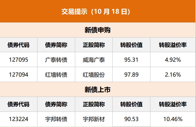 新华网:北京、上海、广州、深圳、重庆等多地城中村改造正稳步铺开。目前我国已入库城中村改造项目达162个。城中村改造在改善居民生活环境的同时,蝶变新生的空间也化作了发展新增量,有数据保守估计我国每年城中村改造投入金额将达8400亿元。 央视网:“一带一路”国际智库合作委员会全体大会在北京召开。来自40多个国家的70多名前政要、智库机构代表、知名学者为共建“一带一路”出谋划策,推动“一带一路”相关课题研究和学术交流。 央视网:截至目前,第134届广交会共有来自200多个国家和地区的8.7万名境外采购商到会,比上届同期大幅增长。其中,来自共建“一带一路”国家的采购商增幅达60.5%,广交会在促进共建“一带一路”国家贸易畅通中成效显著。 财联社:十年来,“一带一路”倡议取得了巨大成功。截至2022年底,我国已累计与150个国家、32个国际组织签署200余份共建“一带一路”合作文件,内容涵盖互联互通、投资、贸易、金融、科技、社会、人文、民生、海洋、电子商务等领域。 21世纪经济报道:截至10月16日,17个地方已发、待发的特殊再融资债券规模已达到7262亿,预计本轮特殊再融资债券发行规模将超万亿。本轮特殊再融资债券主要用于偿还拖欠款,以缓释地方债务风险。城投债一二级利率继续下行,其中个别城投票面利率较此前下行280BP。但不同机构的策略也有分化,有专注高收益债策略的私募机构已止盈。 上海证券报:在多地特殊再融资债券发行的背景下,地方政府隐性债务化解频传利好。重庆大足实业于10月12日发行了“23大足发展CP002”,期限366日,发行利率3.65%。7月18日发行“23大足发展CP001”票面利率6.59%,发行期限为270日,该债券发行期限更短,票面利率更高,城投公司此前的债务正在被更长期限和低利率的债务替换。 澎湃新闻:据悉,以色列已向美国请求100亿美元的紧急军事援助。美国国会目前正在与白宫协调制定援助计划,其中还将包括为乌克兰和美墨边境等事宜提供的资金。美国国家安全委员会表示,美国对以色列的军事援助不会附带“任何条件”。