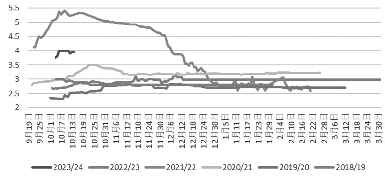 国庆节后,棉花价格冲高回落,最低跌破17000元/吨,短期有所企稳。随着10月新棉收购期的来临,棉农与收购方、下游采购等多方分歧加剧。 USDA10月报告影响中性 根据美国农业部(USDA)10月供需报告,2023/2024年度,全球产量方面,由于巴西、阿根廷和坦桑尼亚产量增加抵消了美国、澳大利亚和希腊的减产,产量最终小幅上调4.6万吨,贸易量及消费量仅小幅下调。期初库存大幅下调,主要是针对巴西棉花年度进行了调整,统一为北半球时间,从而对北半球整体影响中性。 美国方面,2023/2024年度产量下调6.8万吨,尽管其他地区产量增加,但得州干旱延续。截至10月3日,德州干旱程度和覆盖率指数为285,同比高66,比上周减3,因此得州棉花产量继续下调。出口量调减2.2万吨,整体影响中性偏多。 国内方面,新棉收购逐步进入旺季,10月中旬大规模采收开启,棉农与轧花厂之间分歧加大。当下仍处于收购、加工期,对最终产量的定论存在窗口期,减产言论无法证伪。目前,棉农成交底价在8.1元/公斤,折合皮棉18600元/吨。 由于农发行限价收购7.5元/公斤、期现价格倒挂在1500元/吨以上、抛储继续且成交量大幅下滑等因素,轧花厂暂时仍保持冷静谨慎态度。但是轧花厂产能过剩和收购意愿仍强,轧花厂也可以通过基差、期货期权策略等弥补期现倒挂问题,因此,预计收购价在8—8.3元/公斤存在成交意愿。考虑到天气因素,预计后期收购价呈现冲高回落走势。 出口订单难助力 “金九银十”旺季,下游却疲态尽显。出口订单难有起色,自7月以来,欧美日韩的订单明显下滑,尤其出口日韩棉纺量创近五年新低。 开机率方面,棉纱开机率稳中有降,棉布开机率较国庆节前有所回落。库存方面,纺企原料小幅补库的同时,也伴随着成品库存继续上升;下游对于订单持续性并不乐观,织厂采购不多,坯布累库,近期以消化自身棉布库存为主。