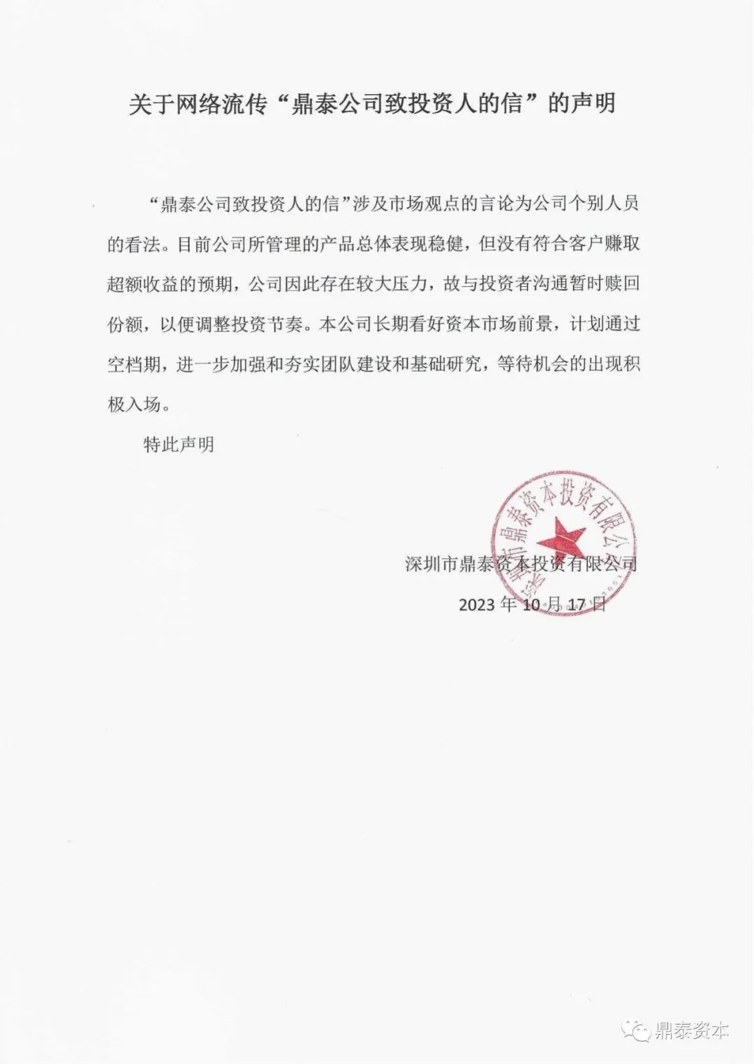 有私募建议客户全部赎回?最新回应来了。 10月17日,一封“‘鼎泰公司’致投资人的信”在社交媒体流传。在这封信中,这家“鼎泰公司”表示,无论国内乃至世界的政经环境,眼前均面临前所未见的巨大不确定性,全球性的史诗级的经济乃至战争危机,无可避免地将在数年内爆发。因此,保守的投资者,实在无必要留守在波动风险最大的资本市场。 “我们郑重建议各位投资人全部赎回本公司基金的份额。因为,股市已失去长期价值投资的基础,我们作为基于企业基本面的长线投资策略已经失效。最后,今年四季度很可能有小幅反弹行情,我们争取在顶部将全部头寸变现,各位投资人可根据自身判断提出赎回。”这家公司表示。 据悉,发布这封信的是深圳市鼎泰资本投资有限公司(以下简称“鼎泰资本”)。 10月17日晚间,鼎泰资本在其官方微信发布声明称,因没有符合客户赚取超额收益的预期,公司存在较大压力,与投资者沟通暂时赎回份额,以便调整投资节奏。但是,“鼎泰公司致投资人的信”涉及市场观点的言论为公司个别人员的看法。目前公司所管理的产品总体表现稳健。 ![]() 鼎泰资本还表示,长期看好资本市场前景,计划通过空档期,进一步加强和夯实团队建设和基础研究,等待机会的出现积极入场。 官网信息显示,鼎泰资本成立于2001年,前身为深圳市盈信投资集团子公司深圳市巨万实业公司,从事股权类的对外投控业务。2016年转型成为专业资产管理公司,同年七月正式发行阳光私募证券投资基金“鼎泰一期”,取得大幅超越市场的回报。 私募排排网数据显示,截至2023年10月,鼎泰资本近一年收益为16.37%,年化收益为5.78%,累计取得9.3%的收益,跑赢同期-13.81%的沪深300指数。目前公司的管理规模为0-5亿元。 从具体产品收益情况来看,目前鼎泰资本在私募排排网上公布净值及业绩曲线的产品仅有一只,是由公司合伙人林波峰管理的鼎泰九剑。该基金成立于2022年4月8日,成立以来收益为7.13%;今年以来截至10月13日,该基金收益率为-7.29%,在同类10670只基金中排名7926,处于中下游水平。 ![]() (文章来源:澎湃新闻) (责任编辑:admin) |