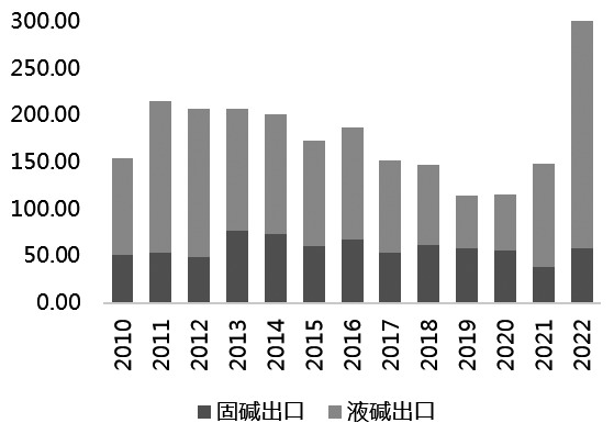 图为中国烧碱分区域产能分布(单位:%) [国内烧碱进出口] 我国是烧碱净出口国,总体看烧碱进出口依存度均不高。对国内市场来,只是供需平衡的调节途径之一;2022年出口放量也只是阶段性的将出口依存度提升至8%。相较于出口而言,进口体量过于微小。 2010—2019年,我国烧碱年度出口量先涨后跌。在2011年达到了最高的215.92万吨,最低点在2019年的114.74万吨。2017—2019年出口量下降一是因为国内价格处于较高水平,出口价格对中国氯碱企业吸引力不足;二是外需不强,出口订单同比下降;三是局部地区开工受限,液碱市场供应量减少,氯碱企业多满足内需为主,出口货源有所减少。 2022年出口量激增的原因较多:一方面,海外能源价格抬升了生产成本,我国烧碱具备价格优势,中国氯碱企业出口积极性变高;另一方面外需增强,印尼当地大型氧化铝产业有百万吨级氧化铝产能投放,对我国烧碱出口量形成支撑。