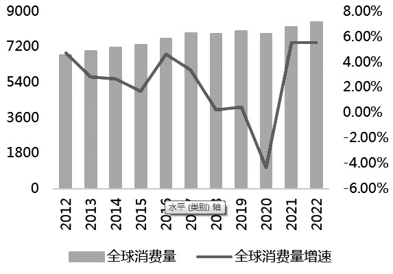 图为全球烧碱消费量(单位:万吨、%)