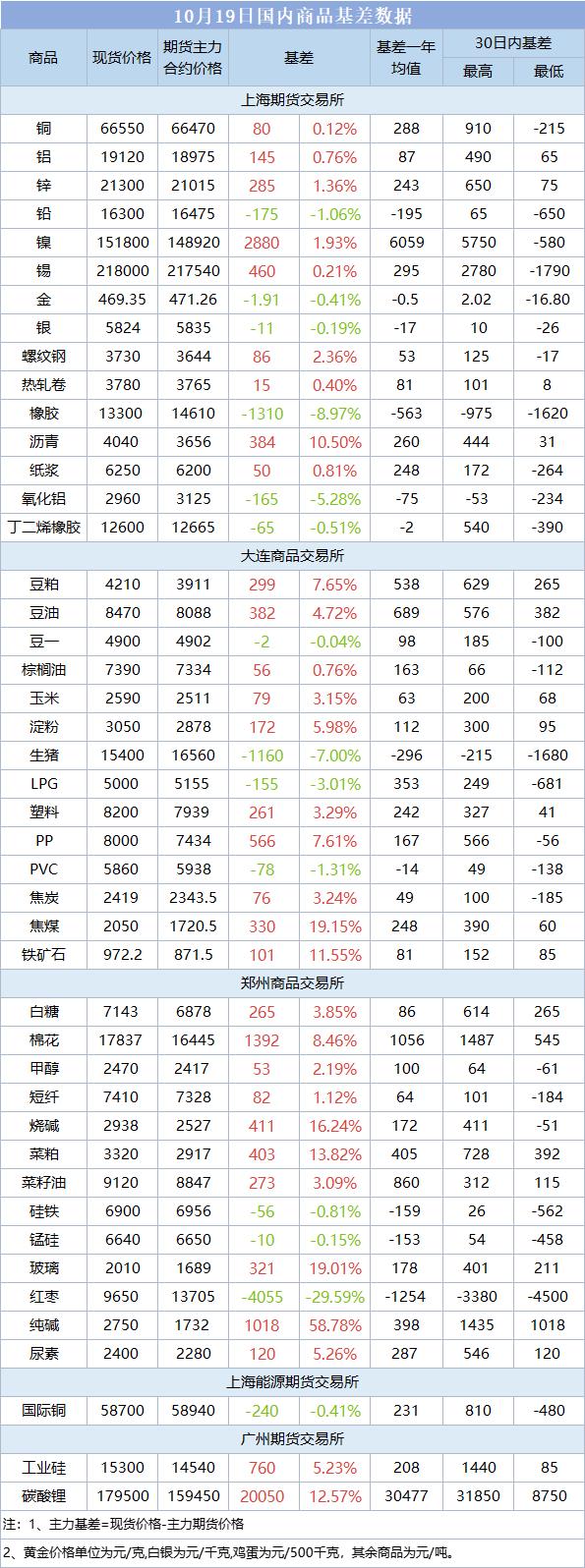 基差报告:10月19日国内商品基差数据一览