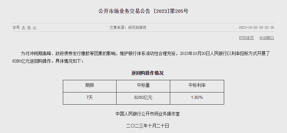 中国央行公开市场今日净投放7330亿元 证券时报 10月20日 央行今日开展8280亿元7天期逆回购操作,中标利率为1.80%,与此前持平。今日有950亿元逆回购到期。(文章来源:证券时报) (责任编辑:admin)
