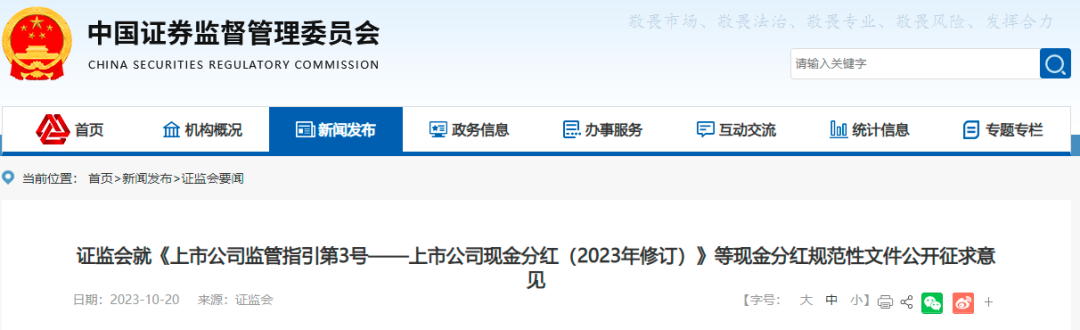 10月20日,证监会发布多条公告,涉及现金分红相关条款修订、企业债券过渡期后转常规有关工作安排等。 同日,中金所发布修订后的2年期国债期货合约及其细则,对2年期国债期货合约最小变动价位进行优化。 证监会就现金分红相关条款修订公开征求意见 据证监会10月20日消息,为进一步健全上市公司常态化分红机制,提高投资者回报水平,中国证监会结合监管实践,对《上市公司监管指引第3号——上市公司现金分红》(以下简称《现金分红指引》),以及《上市公司章程指引》(以下简称《章程指引》)现金分红相关条款进行了修订,现向社会公开征求意见。 ![]() 持续稳定的分红有助于增强投资者回报,推动树立平和的投资理念,促进市场平稳健康发展,同时也有助于减少公司冗余资金、提高资产使用效率,引导公司专注主业。现行《现金分红指引》和《章程指引》颁布实施以来,对健全分红的内部治理机制和外部监管约束发挥了重要作用,A股上市公司分红状况持续改善。近五年来,A股上市公司累计分红8.2万亿元,年度分红金额已开始超过当年股权融资额。其中,2022年共有3291家沪深上市公司进行了现金分红,分红金额2.1万亿元,其中面向境内投资者分红1.6万亿元,同比增长22.7%,分红家数占比67.1%,股利支付率(32.5%)和股息率(1.97%)与全球主要资本市场相比处于中上游水平。一是分红规模增长较快,十年来分红金额年化平均增长13.3%,高于同期净利润增速(约10%)。二是分红习惯逐步养成,分红公司家数占比由十年前的50%左右提升至70%左右,连续5年分红的公司占比由20%提升至48%。三是分红特征总体与企业发展阶段相适应,不同板块、不同行业企业分红水平有所差异。但与境外成熟市场相比,分红均衡性、及时性、稳定性还有待进一步提升,投资者获得感有待增强,还有个别公司异常高比例分红,可能损害偿债能力和持续经营能力,需要及时引导规制。 证监会表示,本次现金分红规则修订主要思路是在坚持公司自治的基础上,鼓励公司在章程中制定明确的分红政策,稳定投资者分红预期,对不分红、财务投资规模较大但分红比例不高的公司,通过强化披露要求督促分红;便利公司中期分红实施程序,鼓励公司增加现金分红频次;加强对异常高比例分红企业的约束,引导合理分红。 《现金分红指引》修订内容主要有三个方面:一是进一步明确鼓励现金分红导向,推动提高分红水平。对不分红的公司加强披露要求等制度约束督促分红。对财务投资较多但分红水平偏低的公司进行重点关注,督促提高分红水平,专注主业。二是简化中期分红程序,推动进一步优化分红方式和节奏。鼓励公司在条件允许的情况下增加分红频次,结合监管实践,允许上市公司在召开年度股东大会审议年度利润分配方案时,在一定额度内审议批准下一年中期现金分红条件和上限,便利公司进一步提升分红频次,让投资者更好规划资金安排,更早分享企业成长红利。三是加强对异常高比例分红企业的约束,引导合理分红。强调上市公司制定现金分红政策时,应综合考虑自身盈利水平、资金支出安排和债务偿还能力,兼顾投资者回报和公司发展。对资产负债率较高且经营活动现金流量不佳,存在大比例现金分红情形的公司保持重点关注,防止对企业生产经营、偿债能力产生不利影响。 《上市公司章程指引》相关条款修改主要有三个方面:一是鼓励上市公司在符合利润分配的条件下增加现金分红频次,引导形成中期分红习惯,稳定投资者分红预期。二是根据《现金分红指引》关于优化中期现金分红实施程序的制度安排,新增对中期分红的完成时限要求。三是督促公司在章程中细化分红政策,明确现金分红的目标,更好稳定投资者预期。同时,引导公司在章程中制定分红约束条款,防范企业在利润不真实、债务过高的情形下实施分红放大风险。 沪深证券交易所将同步修改完善上市公司规范运作指引,明确操作性要求。下一步,证监会将根据公开征求意见情况,进一步完善《现金分红指引》及《章程指引》,尽快发布实施。 证监会:将公募REITs试点资产类型拓展至消费基础设施 据证监会消息,为进一步拓宽基础设施领域不动产投资信托基金(REITs)试点资产范围,丰富投资者选择,促进公募REITs市场健康发展,不断提升资本市场服务实体经济能力,10月20日,证监会发布《关于修改〈公开募集基础设施证券投资基金指引(试行)〉第五十条的决定》,将公募REITs试点资产类型拓展至消费基础设施,自发布之日起施行。 下一步,证监会将会同相关部门单位,推进符合条件的消费基础设施项目发行公募REITs,同时强化市场监管,充分发挥REITs盘活存量资产、扩大有效投资的积极作用。 证监会明确企业债券过渡期后转常规有关工作安排 据证监会消息,10月20日,中国证监会发布关于企业债券过渡期后转常规有关工作安排的公告,自公布之日起施行。根据公告,企业债券发行审核职责划转过渡期至2023年10月20日结束。 关于转常规后企业债券受理审核注册等工作安排,公告称,上海证券交易所、深圳证券交易所、北京证券交易所(以下统称交易所)负责企业债券受理工作,自2023年10月23日9时起开始受理,同时取消企业债券原预约申报环节。中央国债登记结算有限责任公司(以下简称中央结算公司)自2023年10月20日17时起,不再受理企业债券项目。 对于过渡期结束