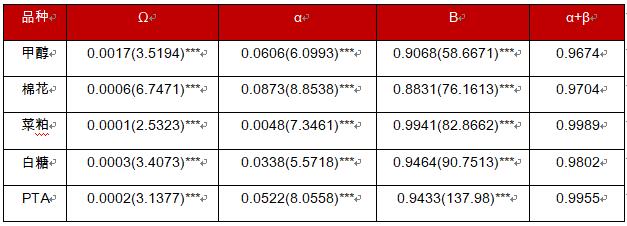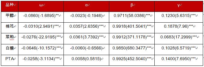 表三 EGARCH模型度量结果(注:*、**、***分别表示在10%、5%和1%的显著性水平下显著) 表三展示了5个商品期货的EGARCH模型度量结果,其中相关参数ω、α、β和γ的含义参见EGARCH模型。由表中可以清晰得得出以下结论:1.棉花和菜粕的α系数为正,这表明标的上涨会增加波动率,而甲醇、白糖和PTA的α系数绝对值接近于0,这表明标的上涨或下跌都会增加波动率。2.棉花和菜粕都存在显著的非对称性,而甲醇、白糖和PTA的波动率非对称性不显著,这表现在EGARCH模型中,棉花和菜粕的α参数都在5%的置信水平下显著;而甲醇、白糖和PTA的α参数不显著。 非对称性对于期权交易尤其重要,尤其是作为期权的卖方,在出现波动率快速上涨的行情当中,卖方往往容易面临较大风险。上述品种中菜粕和棉花都有较为明显的非对称性,那么在标的出现趋势上涨的行情当中,波动率会容易出现大幅上涨,此时有经验的期权交易员就会选择在隐含波动率溢价较高的时候做空期权波动率从而进行波动率套利。利用好期权的对称性和非对称性可以更好的选择品种来增加交易胜率。 四、结论 本文主要针对郑商所的明星期权品种进行了波动率特性的比较研究,综合以上讨论可以得到以下两个比较明显的结论。 结论1:5个商品期货都存在明显的均值回归性和聚集性。对于投资者而言,进行波动率交易的基础是波动率的均值回归性和聚集性,因此5个商品期权都是很好的波动率交易品种。 结论2:棉花和菜粕都存在显著的非对称性,这表明上涨行情波动率更容易出现大幅上涨。甲醇、白糖和PTA的波动率非对称性不显著,这表明上涨和下跌都会引起波动率上涨。 (责任编辑:admin) |