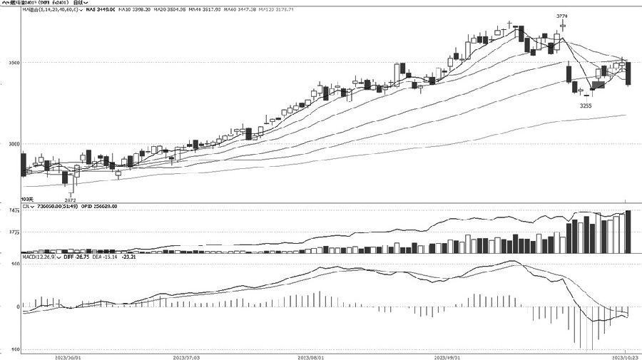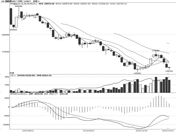 周线上,燃料油2401合约上周反弹后,期价遇阻于10周均线,本周承压下行,周线级别的MACD指标有死叉继续走弱迹象。日线上,周一的大阴线放量增仓跌破之前4个交易日的低点,形成断头铡刀的组合;短期均线空头向下压制期价,特别是20天均线的压力尤为突出;40日、60日均线虽未明显拐头向下,但依然形成反压。综合看,期价有望延续调整格局。操作上,可以3450元/吨做防守,在适量反弹后轻仓参与空单,下方支撑3200元/吨附近。 碳酸锂 二次探底