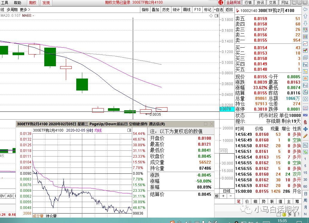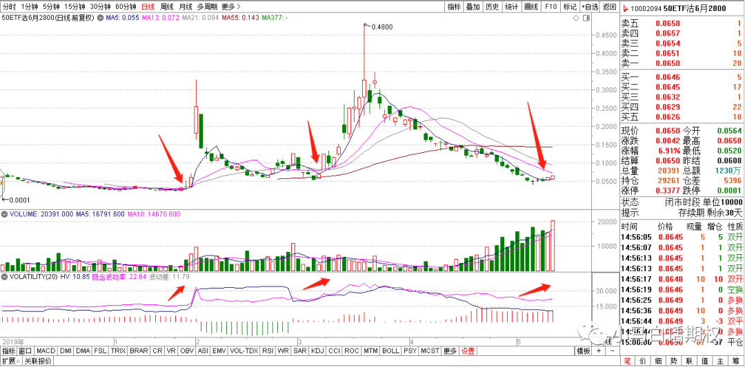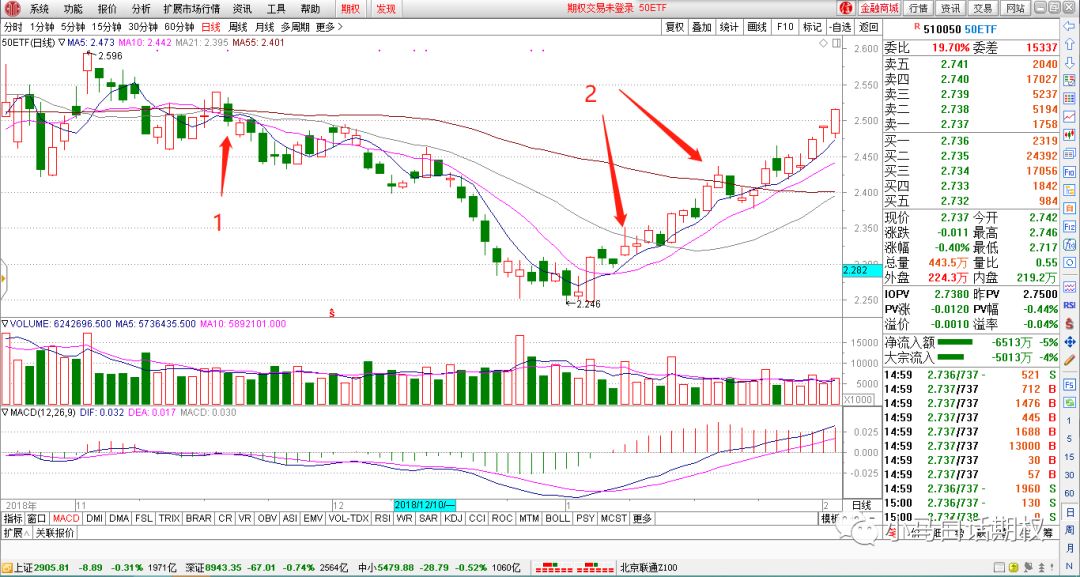 图3 2018年11月-2019年2月50ETF走势 如图3中标识1处的跌破支撑,突破平台,可以做为卖出跨式的止盈参考,标识2中的突破均线压力,可以作为虚值卖出认购的止盈参考。 5. 先收后押来止盈。有人喜欢做买方来博取高倍数,有人喜欢用卖方来赚取稳健收益,其实可以两者结合,在波动率高,期权价格贵的时候选择方向性卖方或卖出跨式先赚取稳健的收益,再用收益的一部分在波动率低和标的方向较为确定时来做买方。还可以先卖出一个期权,比如从500元/张卖到50元/张平仓,如果觉得标的可能反转走势,或者标的在横盘震荡可能选择方向,加上波动率较低,距离到期时间比较短,可以买入开仓这张期权,如果归零,就相当于之前500元/张卖出的期权在100元/张止盈,回撤不大,如果50元/张的期权有较大涨幅,比如涨到100元或200元/张,那对这个月买房收益来说,是个锦上添花的好事情。 6.根据合约的均线来止盈。当你发现卖期权获利的速度逐渐变慢,时间还比较早,而且从期权合约的一些均线上来看 ,突破了单边下降的趋势,这时候可以考虑止盈了。