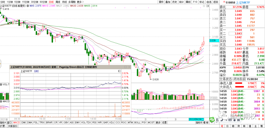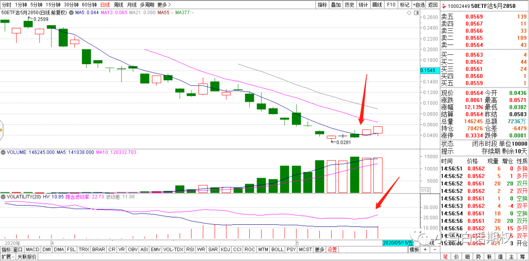 上图中的前两次开黑,都是从该虚值期权站上均线,波动率上升开始的。未雨绸缪,总不会吃大亏。 如果发现危险并未发生,再次开仓就好 卖期权的移仓操作,如果是顺着趋势这个方向,首先要坚信这个趋势还在持续,在卖出的虚值期权、平值期权、实值期权短期内已经收取较多的权利金的情况下,继续持有,较长时间因为下跌的速度变慢,收益金额也不高,则考虑向新的、和原来卖出期权价格差不多的期权合约移仓,如果趋势还在继续,则可以享受新的合约价格快速下降的收益。比如4000元保证金卖出一张500元权利金的期权,当它的价格跌到100元/张时,平仓再卖出下一张500元的期权,等跌到100元/张时,继续卖出下一张500元的期权,如此往复,在趋势性行情里,卖期权一个月的收益可以突破20%。 但是,期权的移仓也要注意顺势追打遭遇反转,行情反转时会快速吞噬之前的利润,这就要做好分批移仓,控制仓位,以及及时控制好回撤,做好止盈止损。 今天的行情盘中快速拉升~~ 收盘问题还不大。