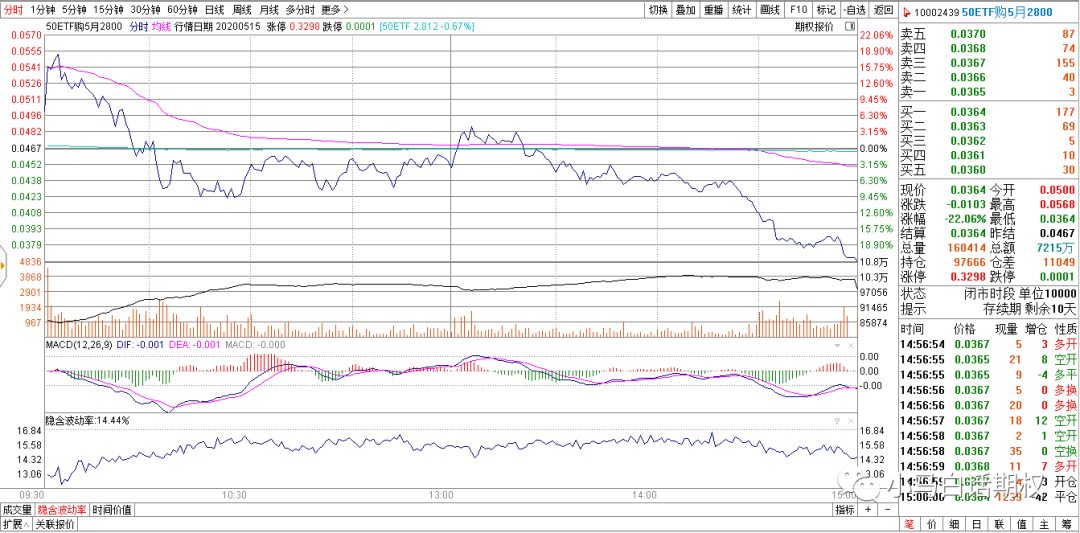 图1 50ETF购5月2800走势 如图1,在5月15日,上述合约在不到一天时间内从550元跌到了360元,如果是中期持仓,已经可以在低点时平仓,等待下次机会,因为已经快速获得了多数的权利金收入。 2. 不赚最后极低的权利金。若卖出一个期权合约,快接近行权日,或者该合约在较长的到期日前价格跌到50元/张以下,按日计算权利金收入已经非常低,而标的刚好在横盘整理,波动率也低,或者标的运行方向刚好顺着这个合约的方向,则要小心方向性突破这类期权成为“彩票”,价格有较大的上涨。