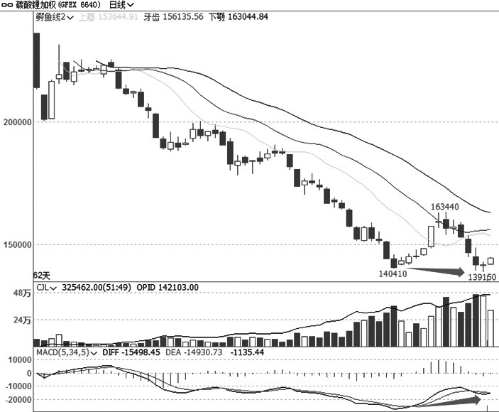 从沪镍加权日线走势图来看,该品种形成一个3个月楔形反弹后,与9月中旬有效突破下行。截至目前,虽然仍维持振荡走低态势,均线系统也呈空头排列,但是从结构上看,小5波走势已经完成。从突破位算起,已经完成反弹幅度一倍的距离及黄金分割支撑位,MACD指标已经低位钝化并有不太明显的背离状态。因此,即便走低,下跌空间也不大,有可能是最后一波。从大的格局来看,MACD上也有了大级别的底部背离,后市有望展开一波反弹。 碳酸锂 有望形成底部