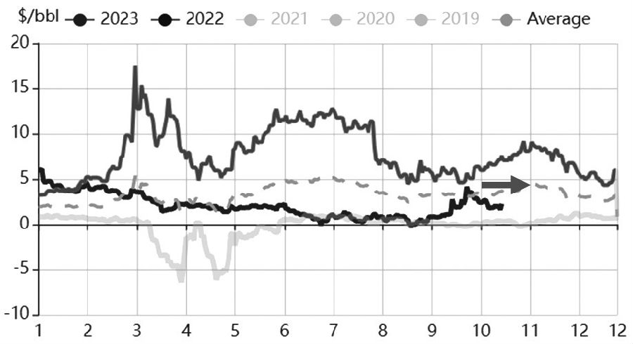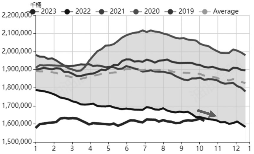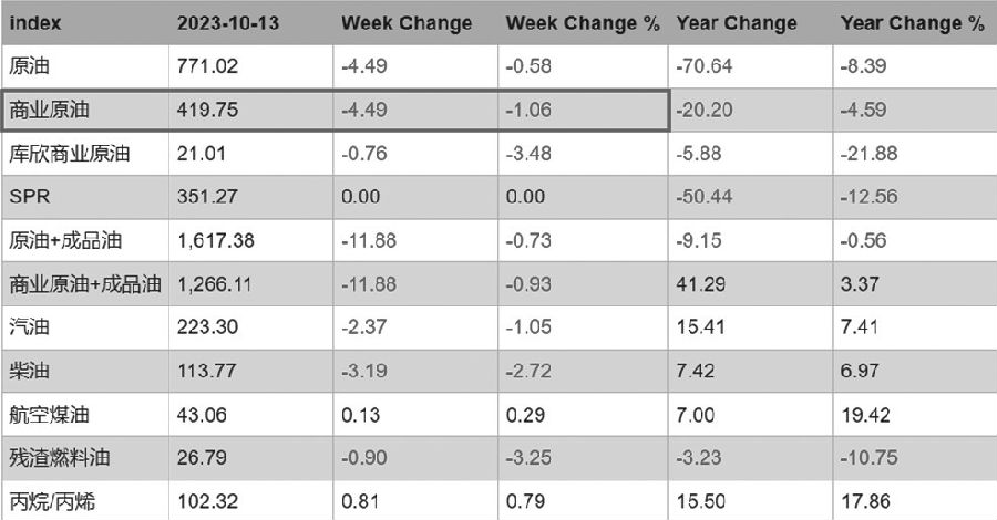 图为布伦特原油与迪拜原油价差季节变化 3 84美元/桶或是油价近期的低点 除巴以冲突升级之外,基本面因素也支撑油价。美国石油协会(API)的最新库存数据显示,截至10月13日,美国原油库存下降440万桶,降幅远超预期(下降30万桶)。EIA的库存报告显示,美国商业原油库存下降450万桶(预期下降30万桶),汽油库存下降240万桶(预期下降110万桶),柴油库存下降320万桶(预期下降140万桶)。数据公布后,布伦特原油价格短线反弹超过50美分/桶。然而400万桶左右的数据下降并不值得市场持续为油价上涨买单,因此我们认为后续因EIA库存数据的超预期溢价已消化。 目前,伊朗对以色列的制裁以及对原油禁运的呼吁,暂时没有得到阿拉伯国家的支持,这跟1973年第四次中东战争阿拉伯国家争相主动禁运的情形大相径庭,而且OPEC+第一时间甚至撇清关系。因此,即使原油禁运达成了,也无法达到当年的效果。第一,综合考虑原油和NGL,美国已经基本实现能源自给。第二,OECD需求在全球占比大幅降低,从1973年的75%下降到现在的45%,很难对非OECD国家进行禁运。