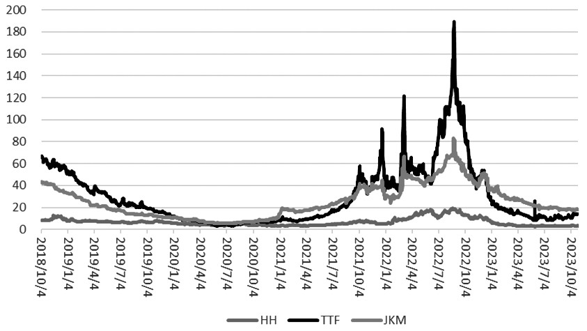 图为欧洲18国天然气库存利用率(单位:%) 2021年以来全球天然气市场就持续处于高波动的格局当中。2022年有俄乌冲突的影响,2023年迄今一些突发的供应中断问题再次引发了天然气价格的非理性上涨。梳理天然气市场时,就会看到引爆全球市场波动的是欧洲,这不仅因为欧洲的进口依存度较高,也因为天然气在欧洲能源中的占比也较高。 欧洲是天然气市场的风暴眼,我们先简单梳理一下过去三年欧洲天然气市场波动的主逻辑。 2021年,欧洲天然气市场的小危机缘于俄罗斯对欧洲的天然气供应仅维持在2020年的水平,2020年全球遭遇新冠疫情,需求都出现骤降。2021年,中国液化天然气(LNG)进口量大幅攀升,中国一跃成为全球最大的天然气进口国,这也减少了欧洲可用的LNG进口资源。2021年,欧洲爆发了天然气危机。 2022年的突出事件是俄乌冲突,俄乌冲突爆发在2022年2月,而天然气危机发生在2023年的8月,欧洲天然气价格创下历史纪录峰值。这是供需两端因素共同促成的,供应上美国的Freeport港口发生爆炸意外停运,影响了美国18%的LNG出口;俄罗斯的“北溪一号”供气量时断时续,9月2日直接完全停止天然气运输;再加上夏季天气炎热,电力需求猛增,核能发电受限于河流水温偏高等因素,欧洲天然气价格一跃创出历史新高。高价格打压了需求,高价格也吸引了全球的供应,LNG船源源不断运至欧洲各国,叠加2022—2023年意外温暖的冬季,天然气价格从2022年8月26日的642欧元/兆瓦时跌到了2023年6月的28欧元/兆瓦时,跌幅高达95.6%。截至10月31日,欧洲TTF天然气价格在50欧元/兆瓦时上下波动。
