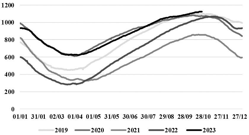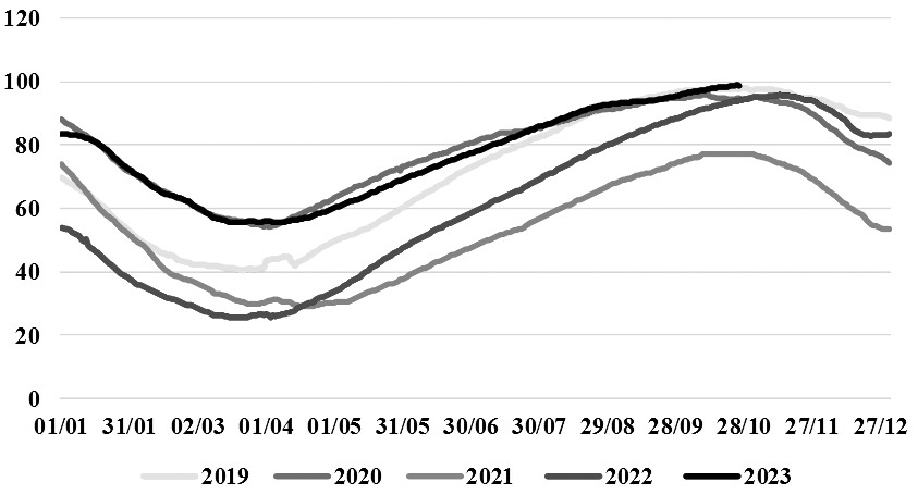 图为全球天然气价格走势(单位:欧元/兆瓦时) 当下三大需求的驱动力 接下来我们再看当下天然气市场的供需主驱动是什么。首先从欧洲天然气市场的需求格局来看,冬季是天然气的需求旺季,取暖季一般从每年的10月1日开始到第二年的3月底。其间天然气的需求主要分为三大块:居民和商业用气(LDZ)、工业用气和电力用气,其中居民和商业用气比例为55%—65%;工业用气比例在2016—2020年为23%,目前大概为20%;剩下的就是电力用气。 首先看工业用气。工业用气的增长受限于欧洲低迷的经济前景。10月24日,标准普尔全球公布的10月欧元区综合PMI从9月的47.2降至46.5,创35个月来新低,显示出欧元区经济活动加速下滑,欧元区下半年出现技术性衰退的风险明显增加。欧元区10月制造PMI初值录得43.1,低于9月的43.4,为近3个月的低位。分析欧洲最大经济体德国,可以发现,该国大多数能源密集型行业的生产并没有出现复苏的迹象,而是继续下降。德国经济智库IFO研究所称,德国化学工业正经历着能源成本高企和订单疲软的严重危机。德国化学工业(包括制药)的产能利用率在2023年二季度再次下降,从一季度的78.6%降至77.3%。低于82%—85%的正常利用率水平。产能利用率低的主要原因是能源成本和终端产品需求不足。2023年冬季工业用气与2022年同期相比可能会有20%的降幅。 其次看电力用气。天然气是欧洲重要的发电能源,具有调峰的作用。2023年与2022年有非常大的不同,在于其他品类能源的发电量出现了跃升,包括风力发电、光伏发电、核能发电,相比2022年都有了较大增长。减量则发生在天然气发电和煤炭发电。2023年夏季德国风力发电的占比达到创纪录的24%,煤炭和天然气发电比例则下降到35%,后者是2018年以来的最低水平。中欧——法国、德国、比利时、英国和意大利的平均风力发电量在11月至次年3月期间可能达到创纪录的41吉瓦,如果该地区的风速与过去10年保持一致的话。 最后再看占比最大的居民和商用气。LDZ的需求量是天气的函数,气温高需求低,气温低则需求高。欧洲联盟气候监测机构哥白尼气候变化服务机构表示,2023年恐怕将是人类历史上最热的一年,6、7、8月全球平均气温为16.77℃,改写2019年的纪录16.48℃。截至10月2日,监测数据显示,2023年全球平均气温增加幅度高出1.5℃阈值的天数已达86天,有些记录甚至高出1.8℃,且天数还有增加的趋势,显著超越了2016年。照这样的演变趋势,2023年全球平均气温打破2016年的纪录应成为大概率事件。 未来供应具有不确定性 整体而言,2023年经历了史上最炎热的夏天,全年的平均气温也有可能创出新的纪录。2023年的冬季很有可能与2022年一样是一个暖冬。与此同时,欧洲民众经历了2022年的高气价,也在积极寻求如何降低对天然气的需求。由于使用热泵和电锅炉供暖的电气化以及能源效率的提高,LDZ天然气需求减少的一部分被认为是永久性的。2022年是欧洲热泵市场的破纪录之年,销量超过300万台。这标志着需求在短短两年内几乎翻了一番。这一激增是由于家庭希望减少天然气消费以应对能源危机,2023年的销量仍可能超过2021年的220万台。消费者取暖行为的永久性转变预计将有助于节省天然气需求。 综上我们看到,欧洲天然气的三大需求在即将到来的冬季都不容乐观。与此同时,天然气供应充满些许不确定性。目前市场的焦点仍是巴以冲突,以色列通过埃及港口出口部分天然气,这部分出口量占全球LNG出口的比例在1%—2.5%,目前这部分出口量在巴以冲突爆发后已经终止。如果巴以冲突不进一步扩大,例如不发生伊朗关闭霍尔木兹海峡等事件,那么巴以冲突对天然气供应的冲击也就仅限于此。 欧洲天然气供应市场另外需要关注的焦点是LNG的供应和挪威气田的生产。2021年俄罗斯的天然气供应占欧洲的比例高达45%,2022年这部分量逐步被LNG和挪威的气田所弥补。10月27日,挪威国家石油公司Equinor调降了该公司全年石油和天然气产量增长目标,将2023年全年油气增长目标从之前的3%下调至1.5%,原因是许多海上油田需要进行大规模检修。2023年夏秋季节挪威气田长时间的检修也给气价带来支撑。欧洲LNG的供应则主要仰赖美国市场。