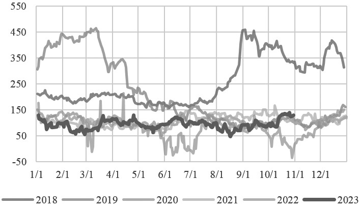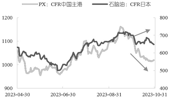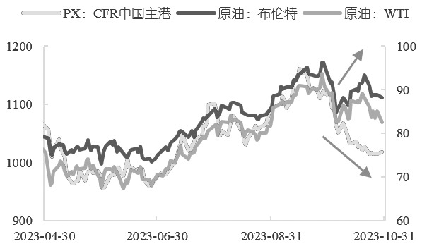 [油价振荡趋稳] 近期,PX走势与原油走势背离。具体来看,在外围宏观偏弱叠加地缘政治因素引起的一系列下跌后,原油出现风险溢价,近期开始小幅反弹,逐渐企稳。反观PX,无论是现货还是期货都不温不火。经历上市初期估值过高的下跌后,近期PX也开始趋稳,但成交量并不高,市场热度有所减退。无论是与原油相比还是与石脑油相比,PX都呈现出“跌跌不休”的状态。 截至10月23日,PX跌至上市以来最低点,报收于8318元/吨。截至10月31日,外盘亚洲PX报收于1029.67美元/吨(CFR中国),国内PX期货报收于8654元/吨,有小幅回弹趋势,但相较上市首日的收盘价9468元/吨,已经下跌814元/吨。
