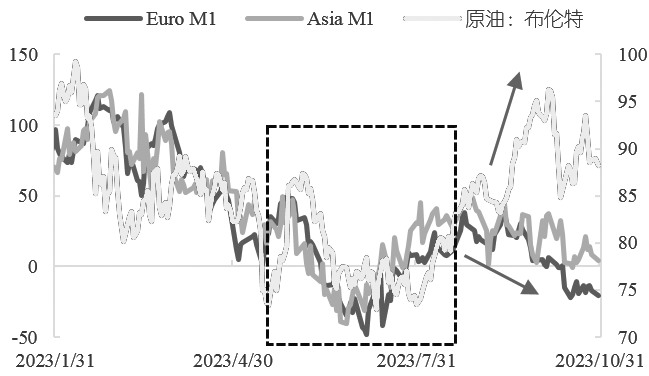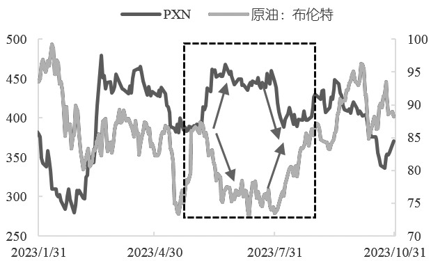 图为PX与石脑油价格走势 (单位:美元/吨,美元/吨) [裂解价差压缩] 今年年初开始,布伦特原油大幅下行至80美元/桶附近。在正常情况下,石脑油—原油价差因原油端大幅波动而走扩,也就意味着石脑油—原油裂解价差与原油价格呈现负相关关系。那么,从何时起这个逻辑发生了改变?笔者认为,主要还是由需求端引起的变化。 历年来,美国夏季出行高峰都会在一定程度上提振原油市场,大致从5月底到9月初,此时正是汽油需求最旺盛的时候。除化工需求之外,近两年PX的另一大需求就是调油,由于PX辛烷值较高,是汽油调油的优良组分,并且在芳烃生产路线中,重整汽油、甲苯和二甲苯都可以作为高辛烷值组分用于调油,满足油品需求,甲苯和二甲苯也可以生产化工原料满足化工需求,所以会涉及芳烃的化工需求与油品需求之间的转换,进而影响PX供应量。 由以上分析可知,在汽油需求旺季,石脑油裂解价差会随着原油呈现正相关波动,而PXN则会出现与原油价格负相关的走势。观察下图方框部分可以明显看出,在北美夏季出行旺季时,石脑油裂解价差与原油价格几乎是同涨同跌,PX强烈的调油需求导致供给变得紧张,从而推升PX价格,最终导致PXN与原油价格反其道而行之。