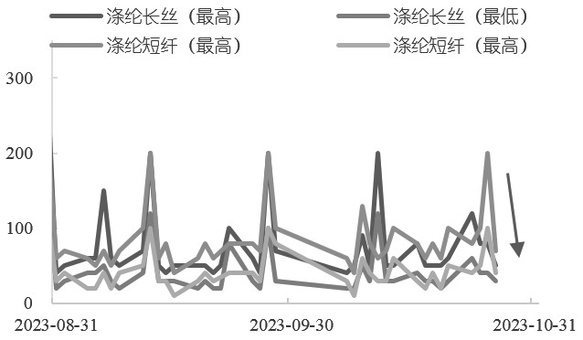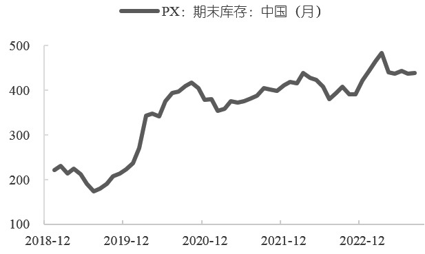 图为PX—MX(单位:美元/吨) 调油逻辑方面,美国自9月15日开始切换冬季汽油,夏季汽油产生的高辛烷值需求回落,汽油裂解价差大幅回落,一定程度上标志着汽油消费开始趋弱。10月初开始,汽油需求迅速走低,成品汽油库存大幅增加,并处于近5年高位,未来一旦走出芳烃调油需求强劲的格局,PX的价格支撑则会出现一定松动,如果缺乏这一利好,PX的价格上行驱动便显得不足。在这种情况下,原油—PTA价格的影响传导可能会变慢。因此,一旦走出北美出行旺季即芳烃调油逻辑,石脑油裂解价差便回到了与原油价格呈负相关关系的走势,PXN则由于PX价格不再强势而偏向于跟随原油波动。 目前,国内PX期货价格呈现弱势格局,主要是因为PX期货相较于PTA期货2405合约、PX期货2405合约估值偏高,加上前期市场做扩PTA加工费、做缩PX—SC价差的策略频出,从而加重了空头情绪。 [整体开工下滑] 截至10月26日,江浙地区长丝产销率最高为50%,涤短产销率最高为70%。截至10月31日,国内涤纶长丝样本企业部分工厂促销,聚酯产销局部较好,半长丝产销在150%左右,短纤产销在八到九成。PX期末库存处在较高位置,虽然近期产量下滑,但仍处在历史同期高位。笔者认为,成本端塌陷只能说明PX价格加速下行,需求不断降低则是PX价格走弱的核心。 6月初开始,聚酯负荷在93%附近的高位维持近3个半月,PTA开工与之相匹配处在相对高位,为PX提供稳定的需求保障。在此期间,虽然PTA加工费低至每吨百元以下,全行业生产亏损,但对上下游配套的一体化企业而言,PXN和聚酯占据整条产业链的大头,PTA亏损完全可以被弥补。同时,大部分企业也想占有PTA市场份额,所以哪怕在加工费较低的情况下,依旧选择保持开工。 9月开始,聚酯开工负荷回落近4%,结束长达3个半月的高位运行态势,PTA企业大型装置停车降负层出不穷。 先有蓬威石化90万吨/年PTA装置9月10日停车,四川能投100万吨/年PTA装置9月20日停车,逸盛新材料360万吨/年PTA装置10月3日停车并推迟重启(已于10月21日重启);后有恒力石化一套220万吨/年PTA装置10月7日停车,福海创450万吨/年PTA装置10月9日负荷降至五成,珠海BP一套110万吨/年PTA装置10月16日停车。至此,在7900万吨/年PTA产能中,10月上旬检修停车的装置就占800万吨左右。 对此,非常明显的体现是PTA开工率显著下降,从10月5日的83.45%降至10月19日的74.96%,继而导致PX需求大幅下滑,自然无法支撑PX价格上行。下游需求显著走低,市场预期PX货源充足,即使广东石化和盛虹炼化的PX装置因故降负,无法抵消PTA端的需求走弱,也无法给PX价格提供足够支撑。因此,PX跌幅较石脑油进一步加深,PXN持续压缩。