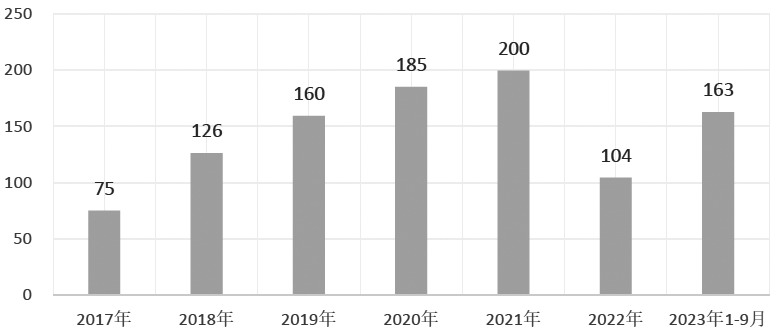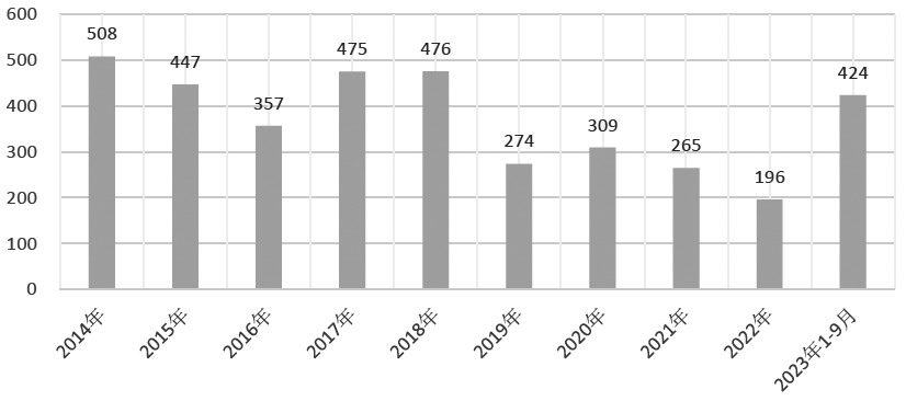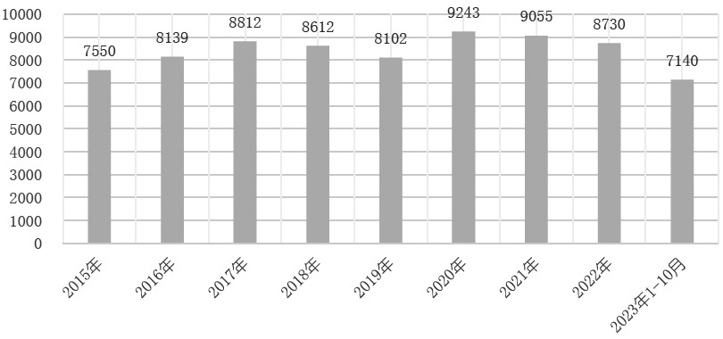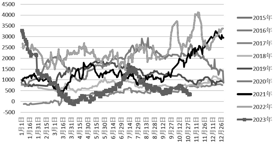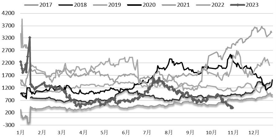 图为我国大豆压榨量(单位:万吨) 我国豆油主要来自进口转基因大豆的压榨,国产大豆一般不用于榨油。据第三方资讯机构统计,1—10月,我国大豆压榨量为7140万吨,去年同期为7086万吨,同比高出54万吨,折算成豆油约10万吨。根据目前的市场情况展望,11—12月,我国大豆压榨仍将平稳运行,不会出现大起大落的情况,所以豆油供应基本上维持平稳态势。除了进口大豆压榨生产的豆油,我国也少量进口豆油。数据显示,1—9月,我国进口豆油28万吨,同比高出6万吨,后续豆油进口量出现大幅波动的可能性小。综合大豆压榨量和进口豆油数量来看,2023年我国豆油增量较为有限。 [E][后市关注多重因素影响] 通常情况下,每吨菜油价格高出豆油几百元到几千元不等,在极端情况下也会出现菜油比豆油价格低的情况。2017—2023年,菜油与豆油现货年度平均价差分别为377元/吨、760元/吨、1267元/吨、1837元/吨、1423元/吨、2377元/吨、773元/吨。通过上文分析可知,全球大豆与菜籽产量并没有出现极端情况。而从2023年我国菜油和豆油供应情况来看,菜油供应增量远超豆油供应增量,这使得原本较高的菜油和豆油现货价差回落到了较低水平。