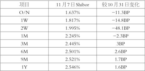 近期国内市场利率呈现近弱长强态势。截至11月7日,上海银行间同业拆放利率(Shibor)隔夜、1周期、2周期、1月期分别报收于1.637%、1.817%、1.995%、2.245%,较10月31日分别下降11.3、14.8、48.1、2.3个基点;3月期、6月期、9月期、1年期利率分别报收于2.445%、2.501%、2.521%、2.546%,较10月31日分别上升3、2.6、1.7、1.6个基点。 本周,央行累计有18980亿元逆回购到期,前两个工作日央行投放了3710亿元逆回购,周内实现净投放基本无悬念,市场流动性仍然较为充裕。本月,央行有8500亿元中期借贷便利(MLF)到期,按照近期央行的操作习惯,大概率实现超额续作。