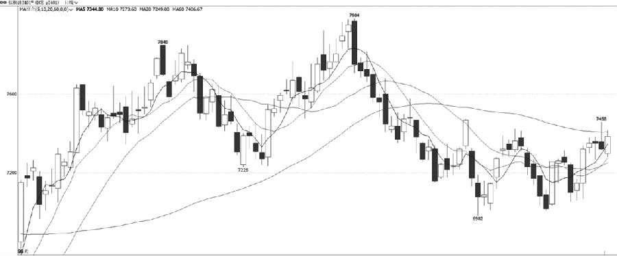 棕榈油2401合约两次反弹至7400点一线后遇阻回落,该位置在60日均线附近。量能方面,近期成交量和持仓量整体变化不大。指标方面,均线系统目前相互交织在一起,MACD指标快慢线仍旧在零轴下方运行。综合来看,棕榈油2401合约目前受制于60日均线一线压力,一旦向上突破,建议可以偏多思路对待。(中原期货 刘培洋)