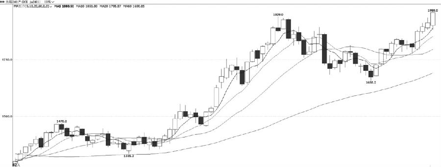 焦煤2401合约本周价格延续走强,并向上突破前期高点1939点一线。量能方面,近期价格上涨过程中成交量一度有所放大,持仓量波动整体则较为平稳。指标方面,均线系统目前处于多头排列,MACD指标快慢线交出金叉后持续走强,且红色能量柱也不断放大。综合来看,焦煤2401合约日线架构创出新高,上涨趋势依旧,建议继续以偏多思路对待,上方关注2000元/吨一线整数关口位置的得失。 棕榈油 上方受压